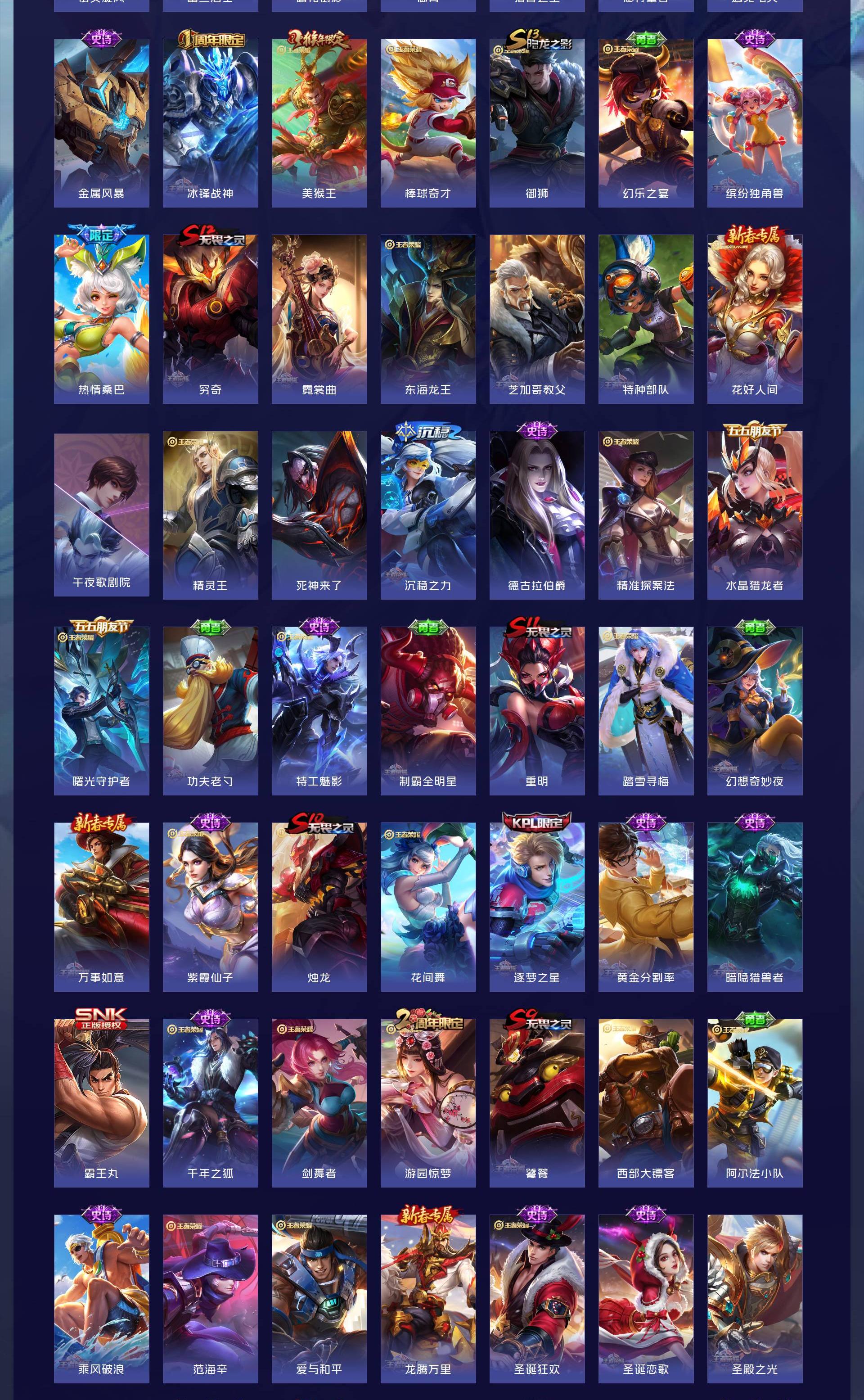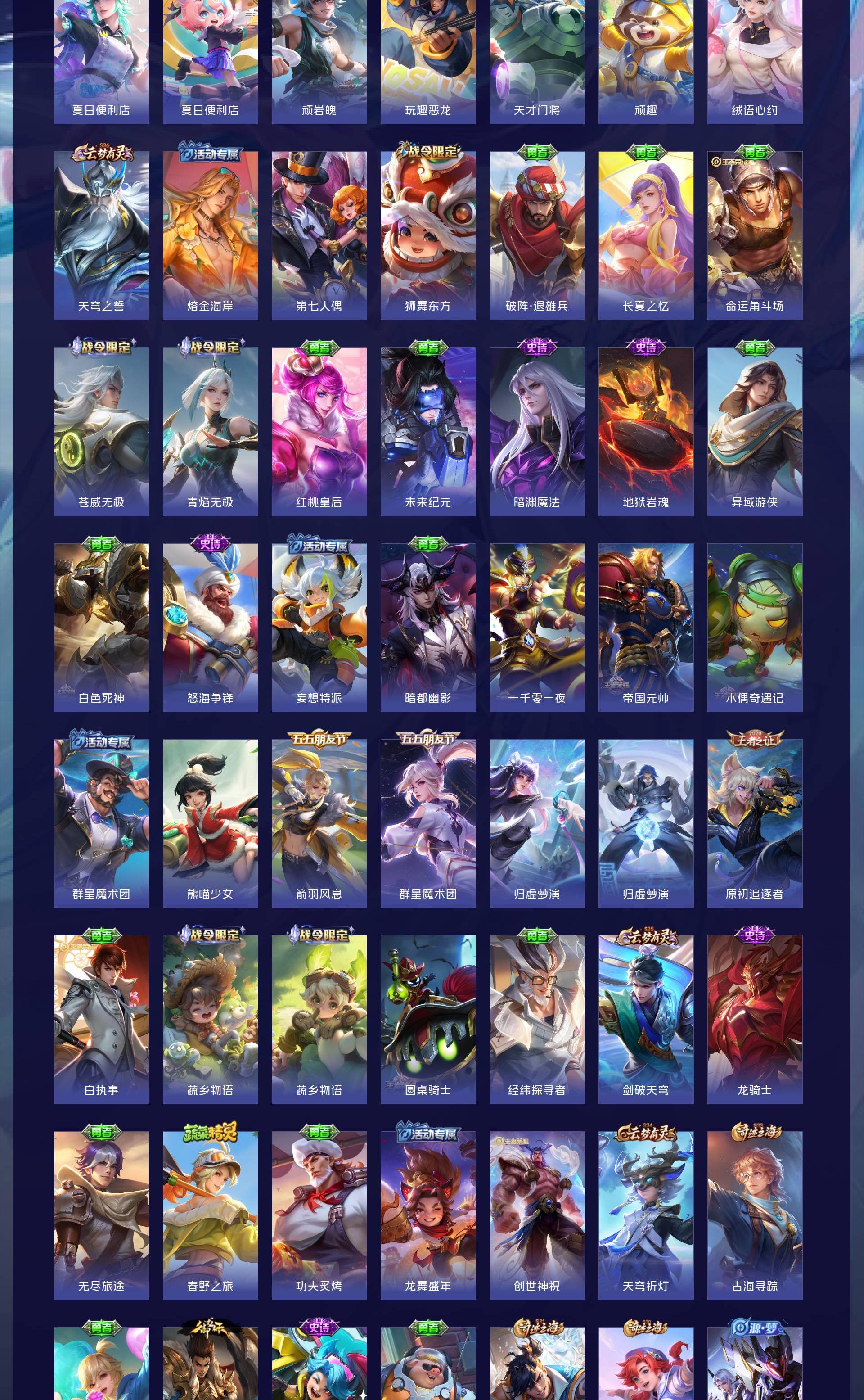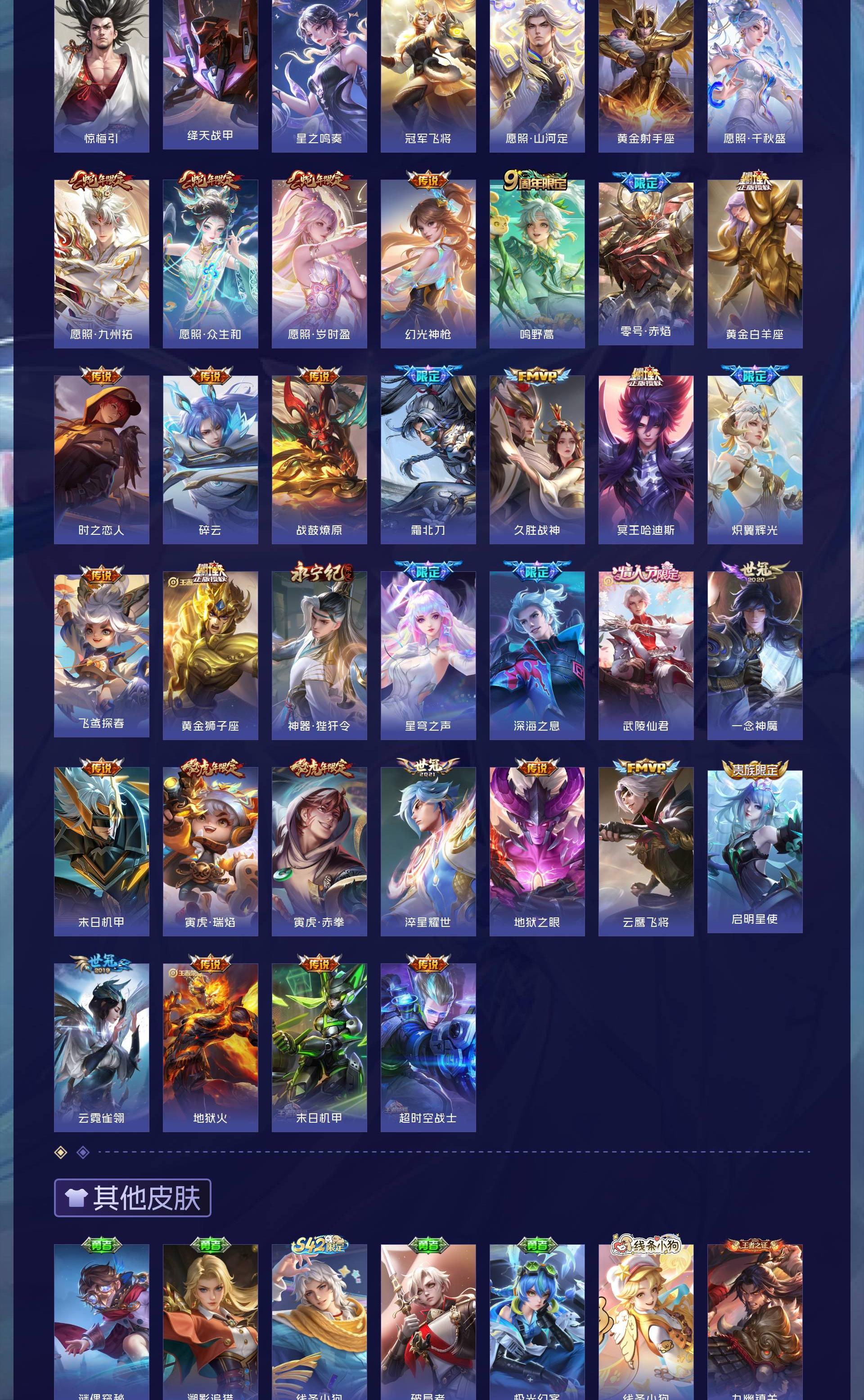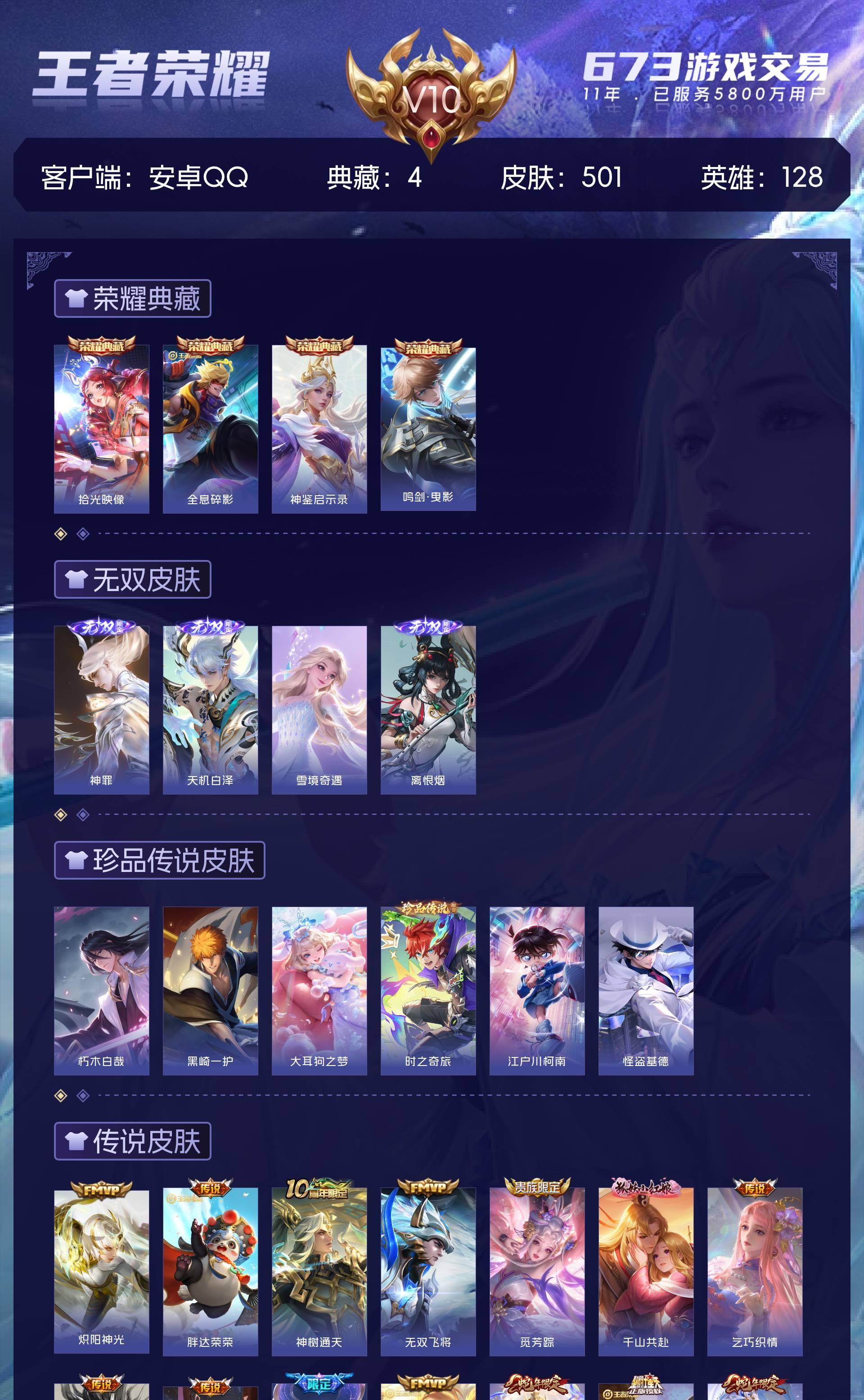 V10 皮肤501 英雄128 至尊星耀 荣耀典藏4 无双皮肤4 珍品传说6 传说46 其他皮肤446
