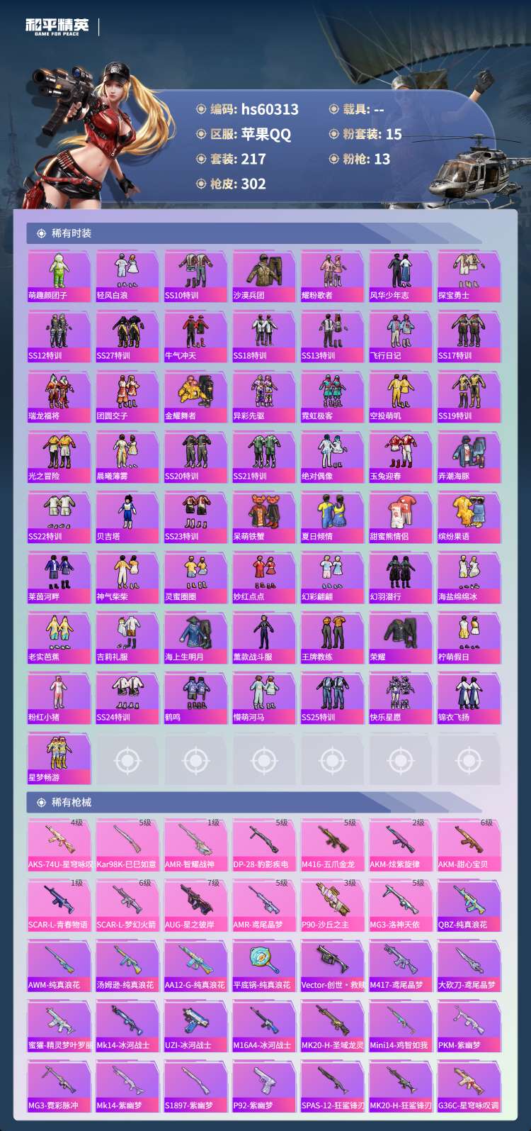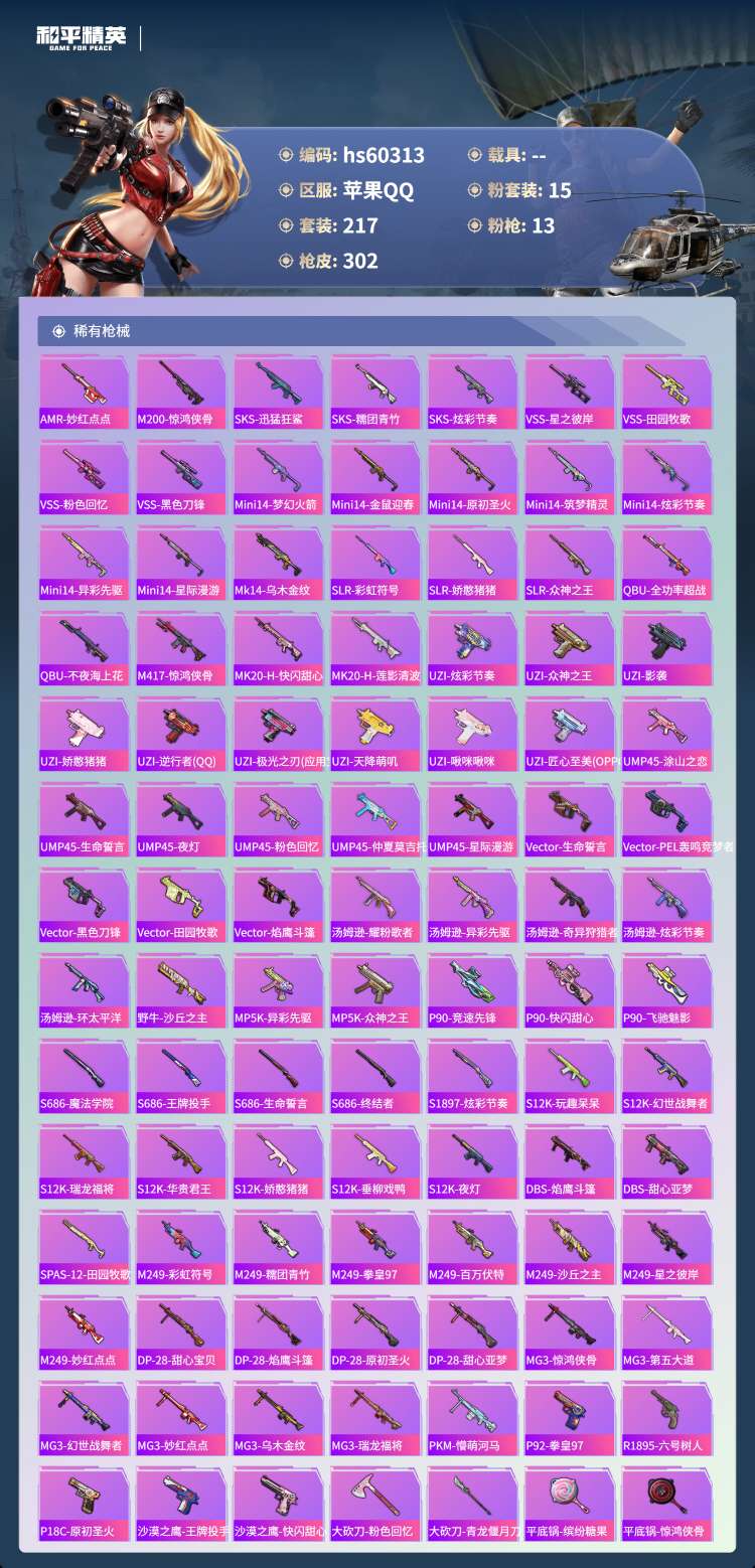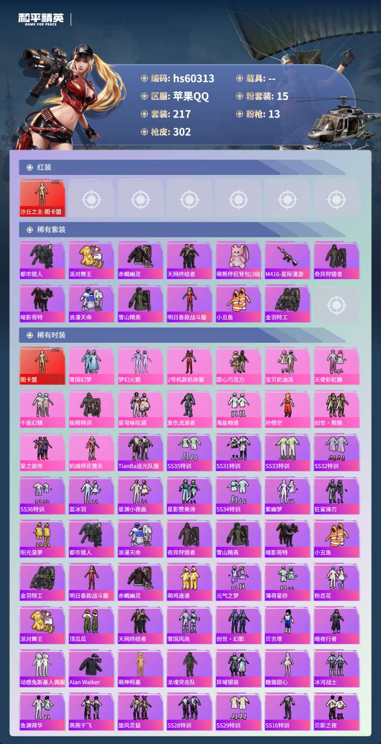 hs60313 苹果手Q-20王牌印记-有战神框-1红装-15粉装-13特效枪-100959热力值-