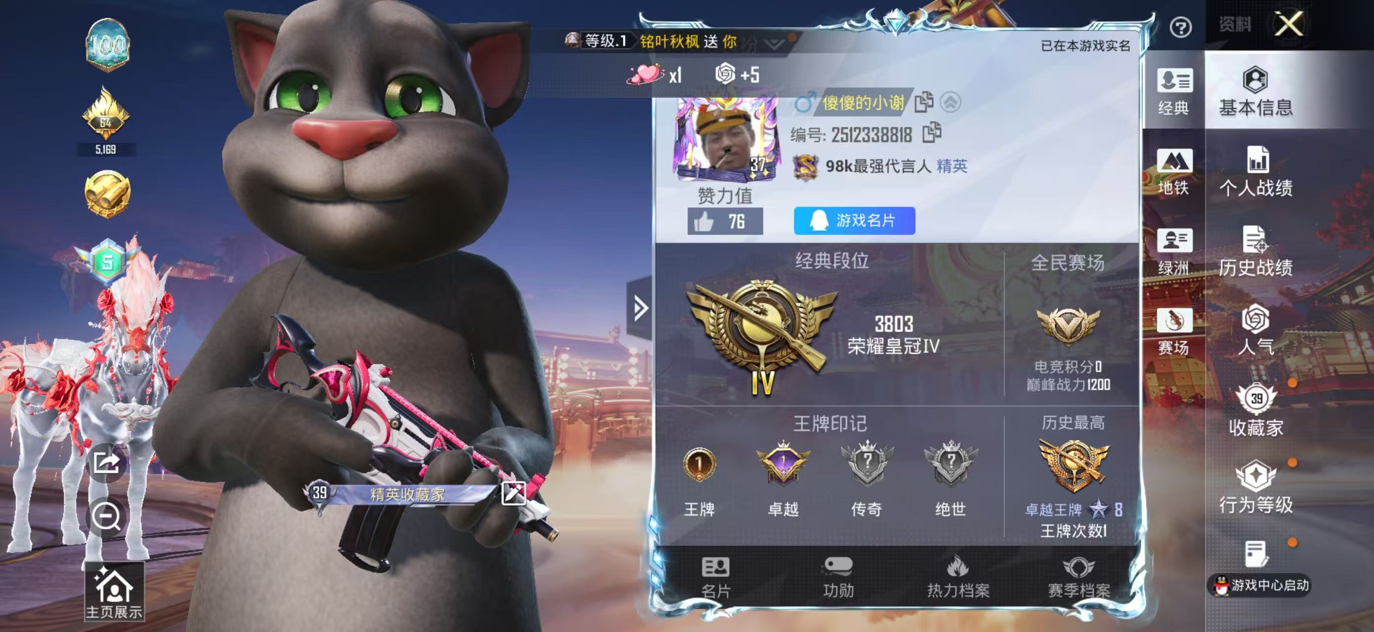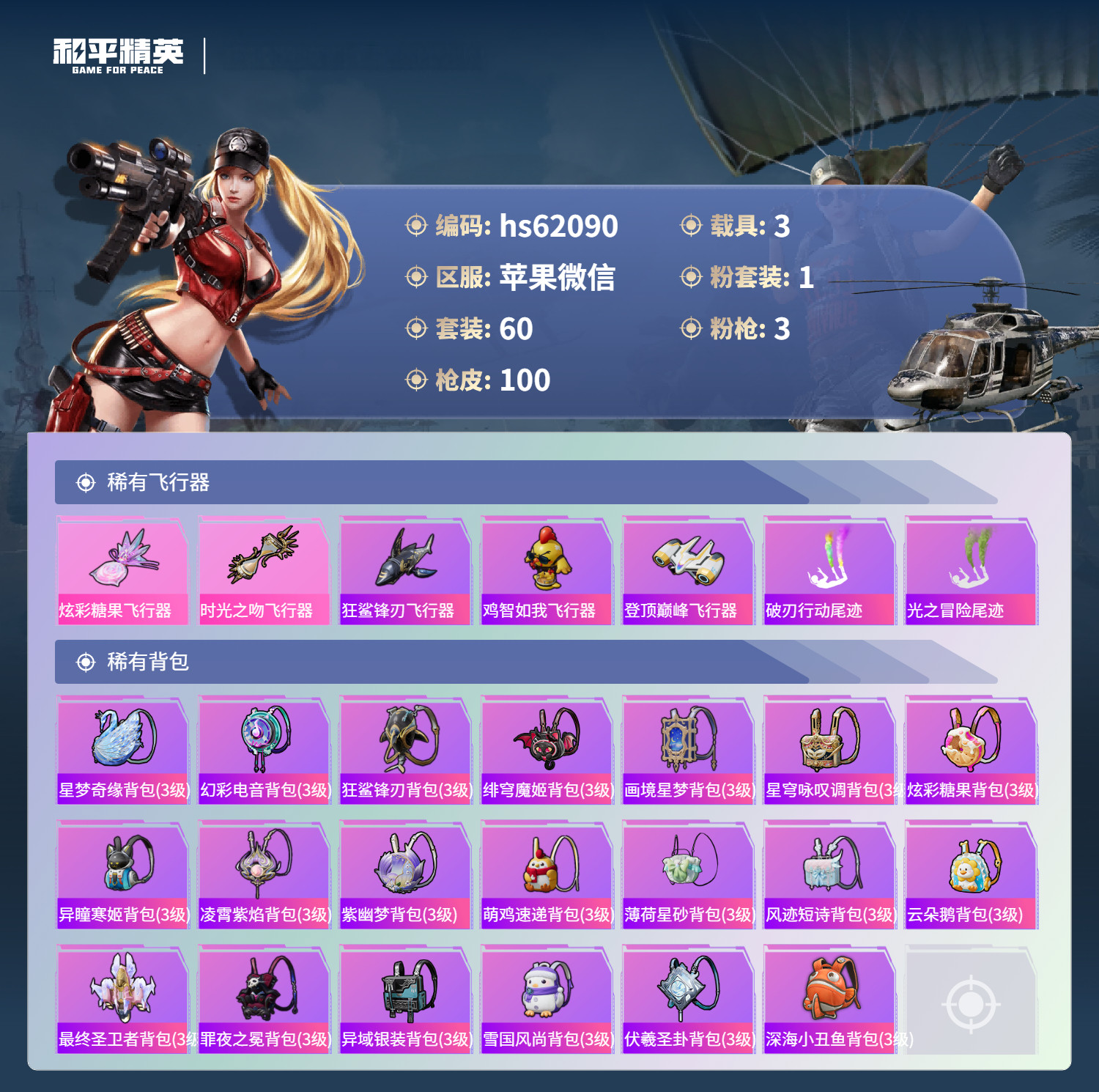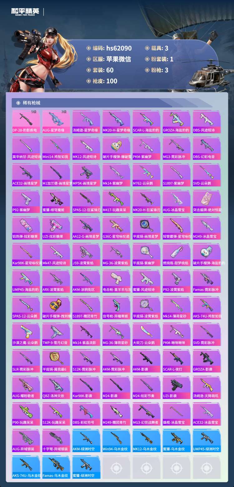 hs62090 苹果微-5王牌印记-1粉装-3特效枪-3载具-27302热力值-60套装-100枪