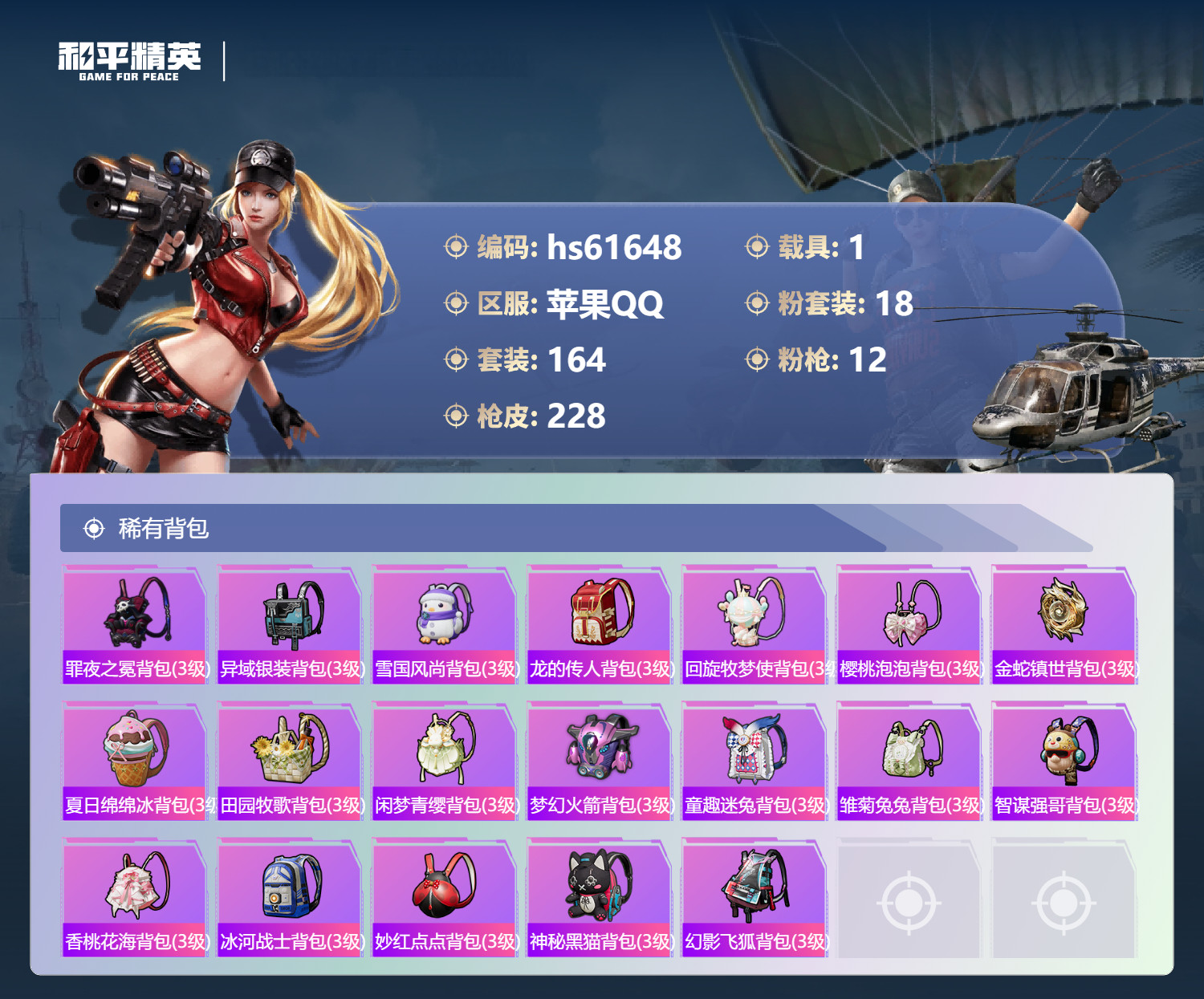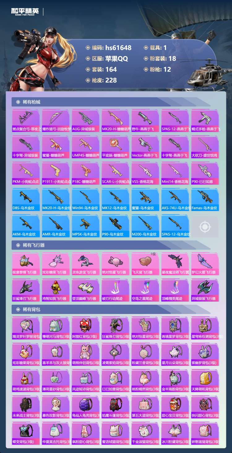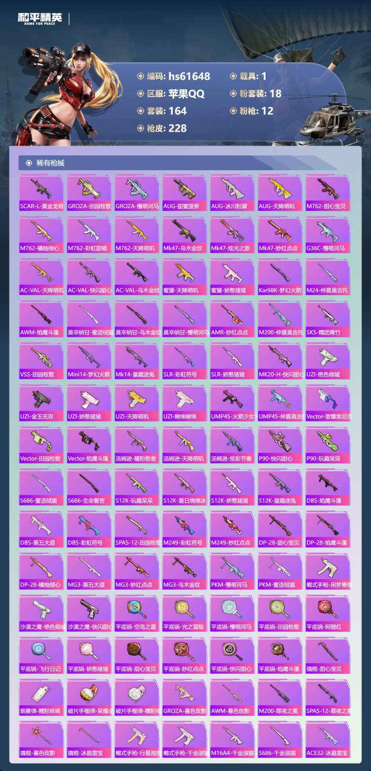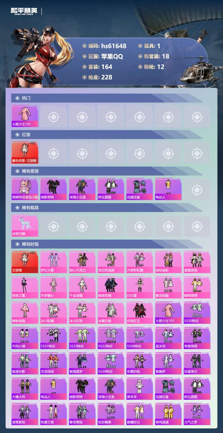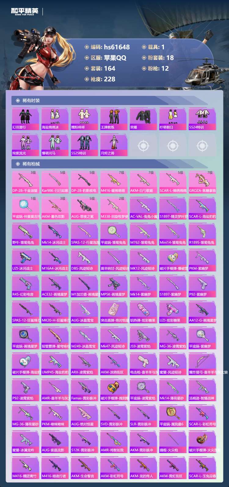 hs61648 苹果手Q-17王牌印记-有战神框-1红装-18粉装-12特效枪-1载具-84334热