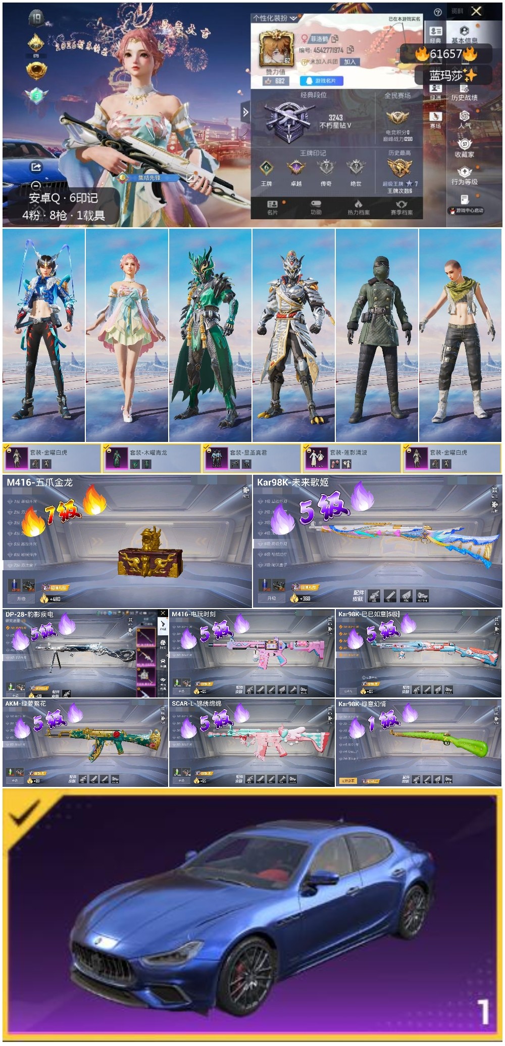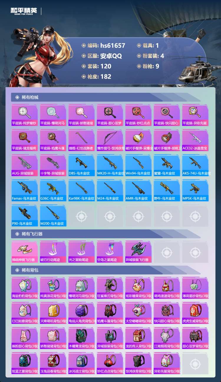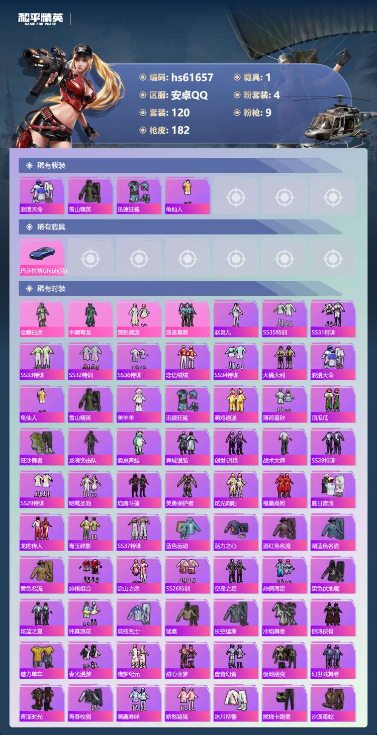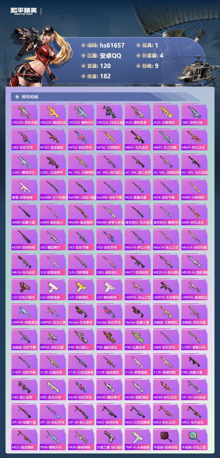 hs61657 安卓手Q-6王牌印记-4粉装-9特效枪-1载具-53497热力值-120套装-182