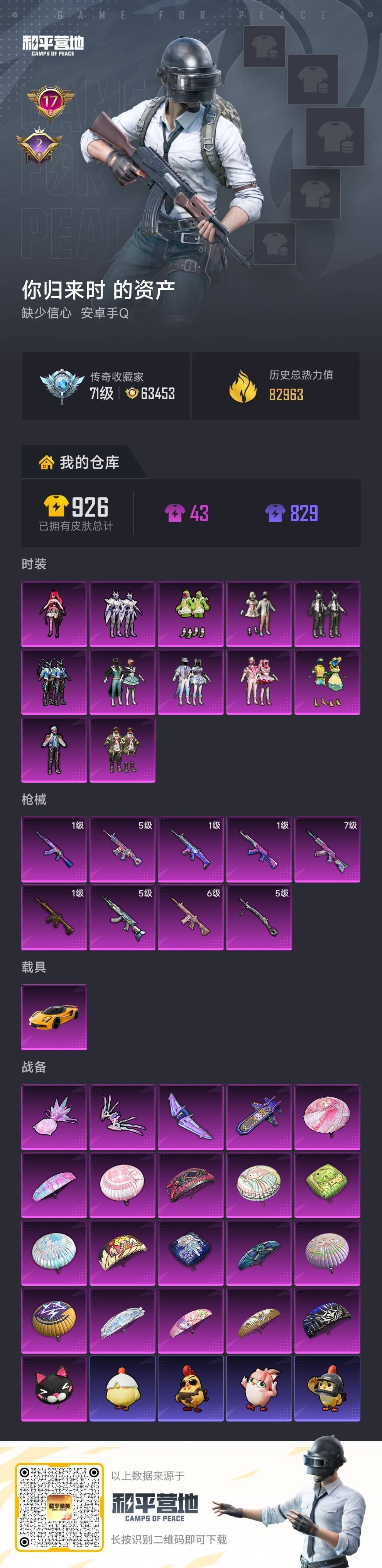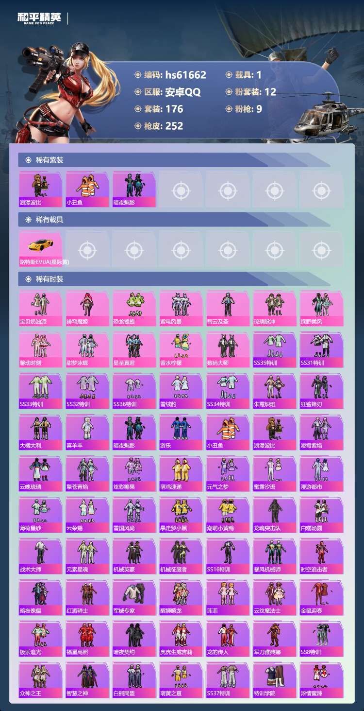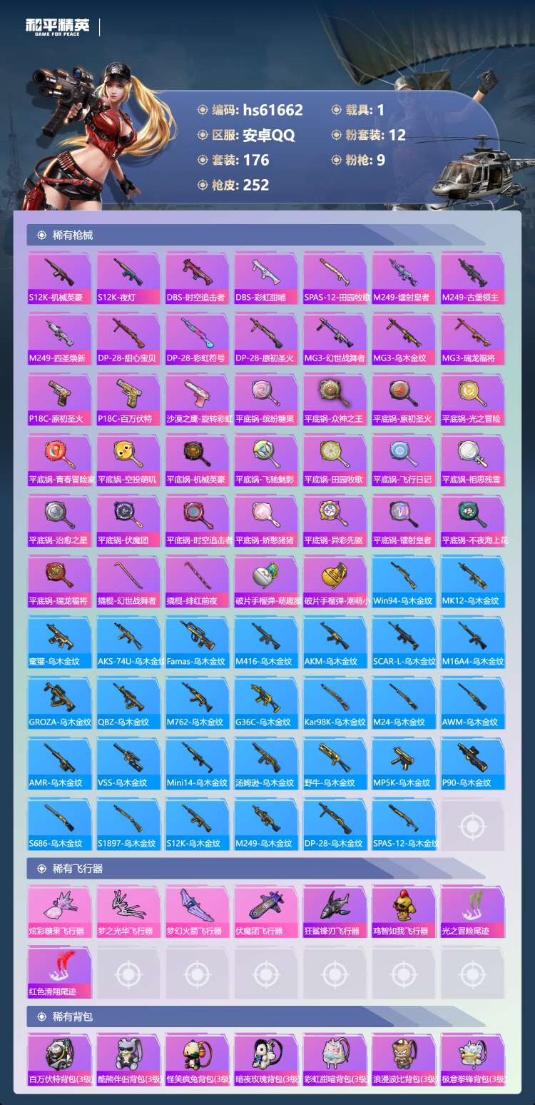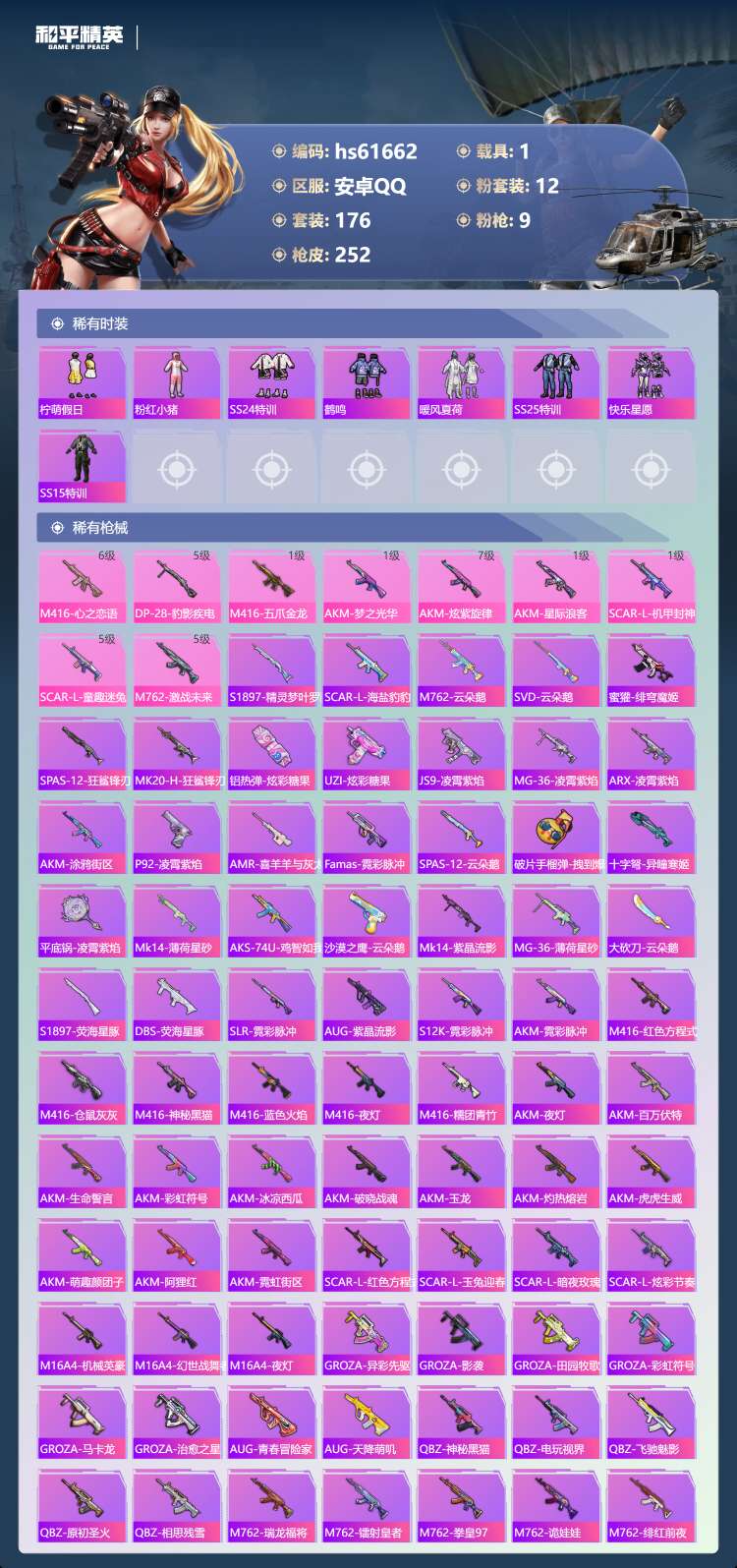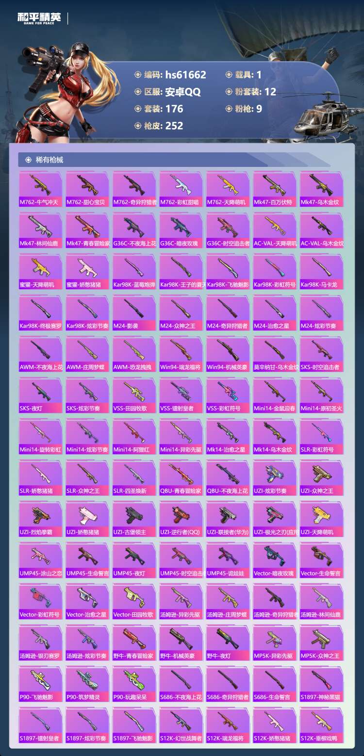 hs61662 安卓手Q-17王牌印记-12粉装-9特效枪-1载具-82963热力值-176套装-2