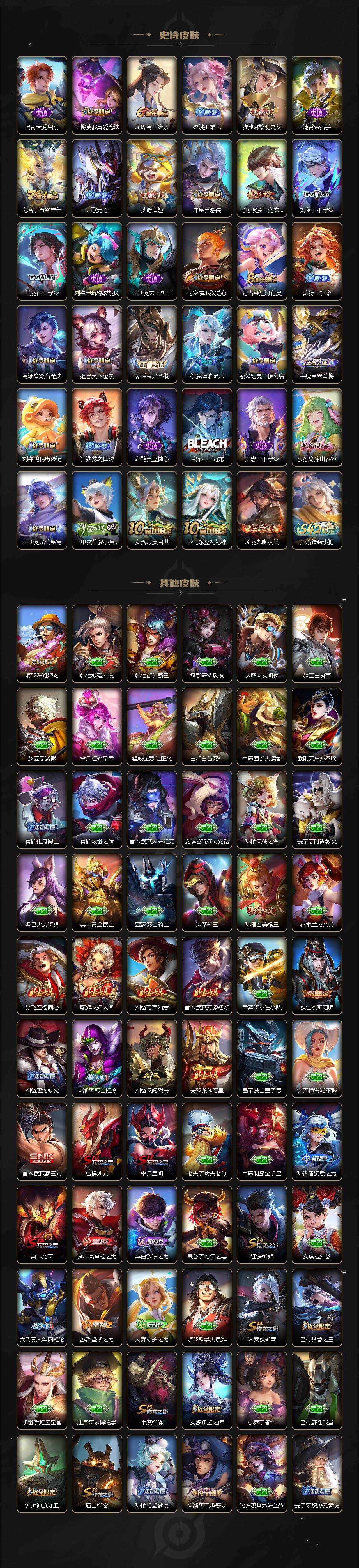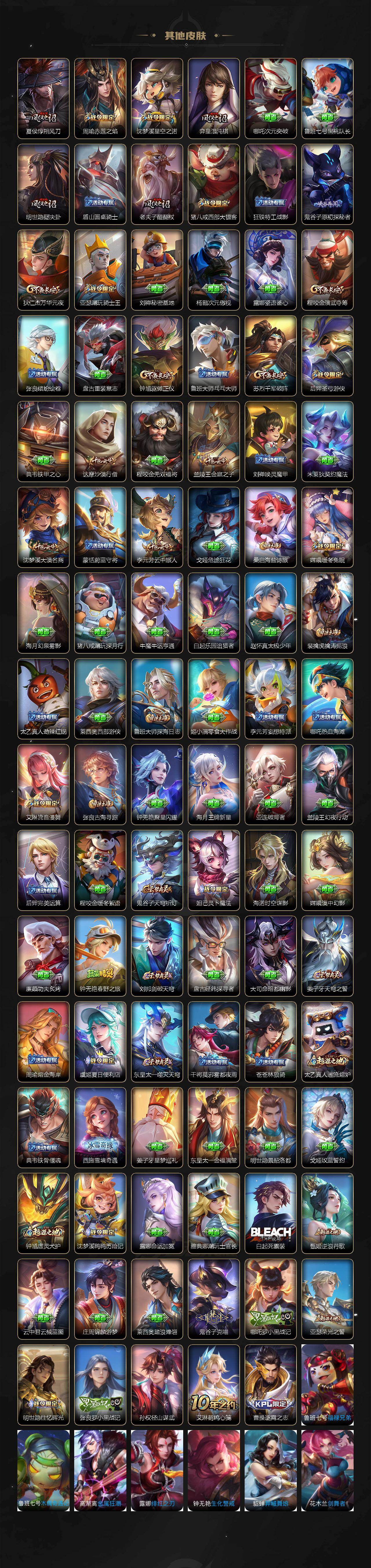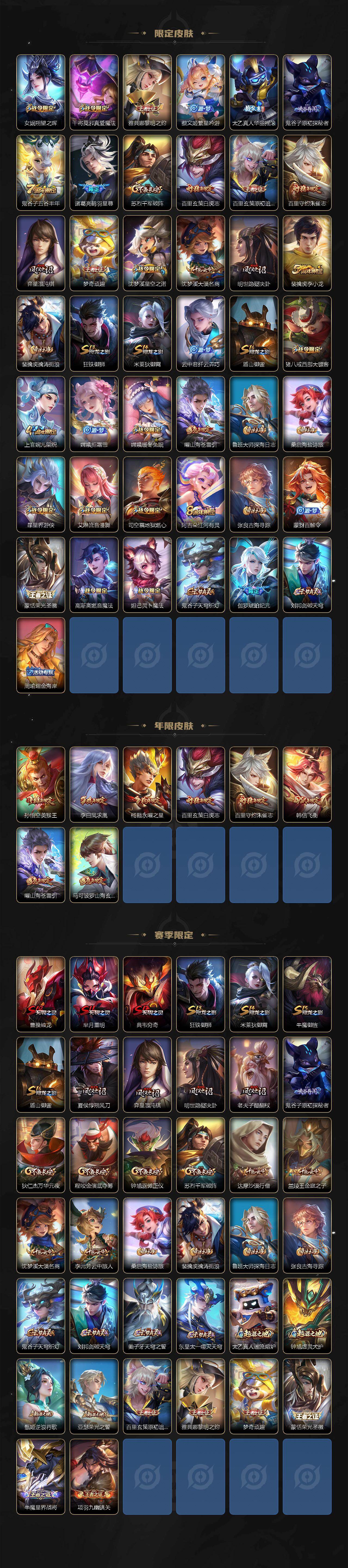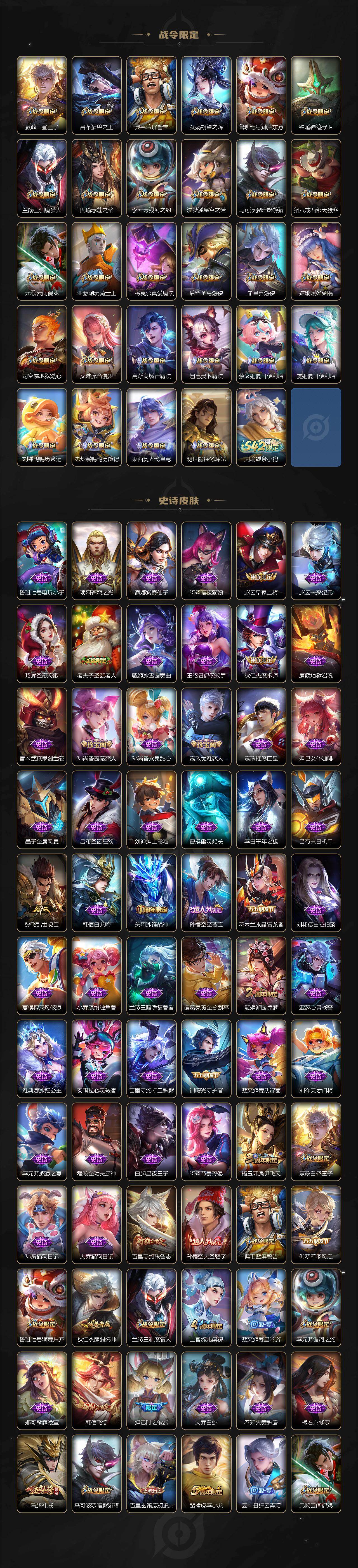 【传说皮肤】:嬴政玄雷天君,桑启鸣野蒿,鲁班七号时之奇旅,诸葛亮鹤羽星尊,张飞百相守梦,曜山海苍雷引,马超无双飞将,孙策末日机甲,赵云淬星耀世,铠绛天战甲,镜炽阳神光,虞姬启明星使,关