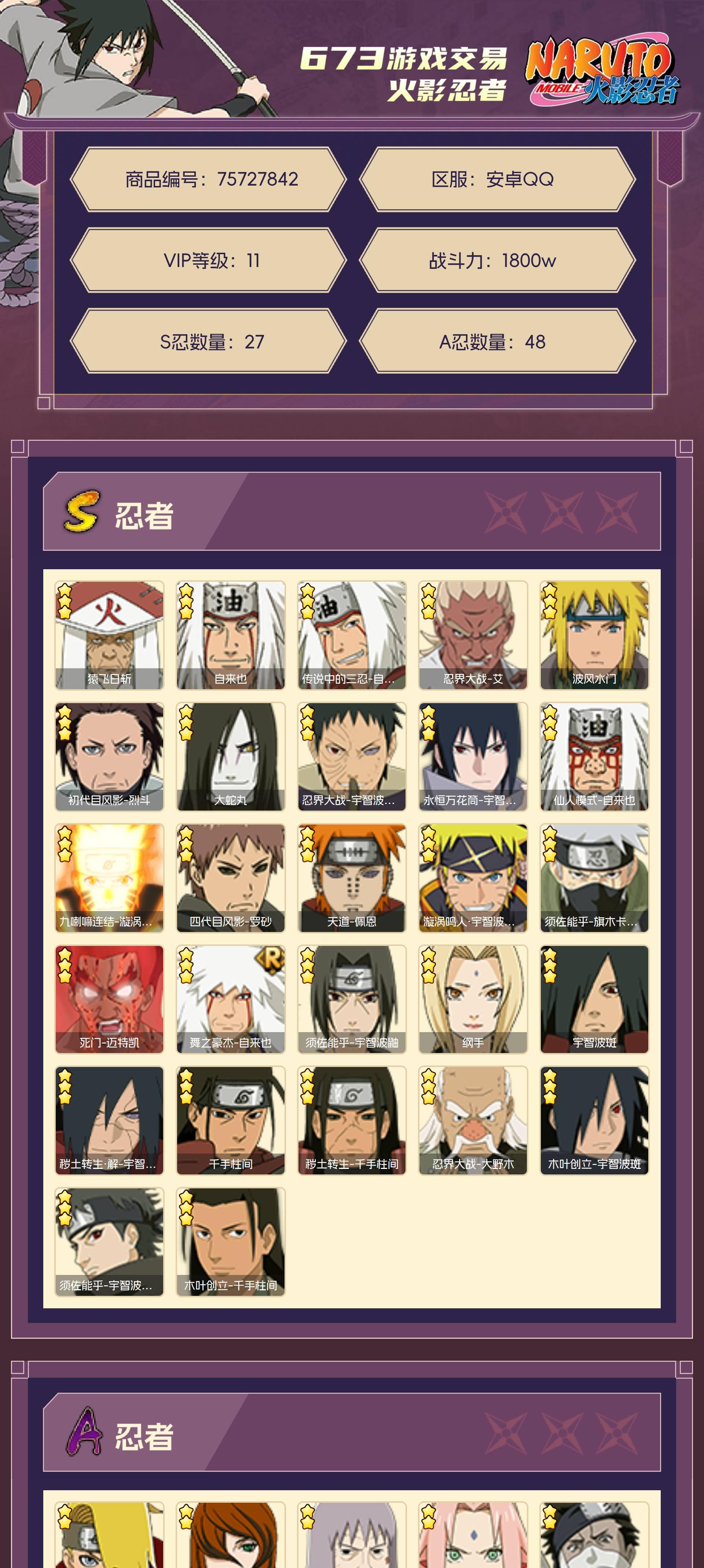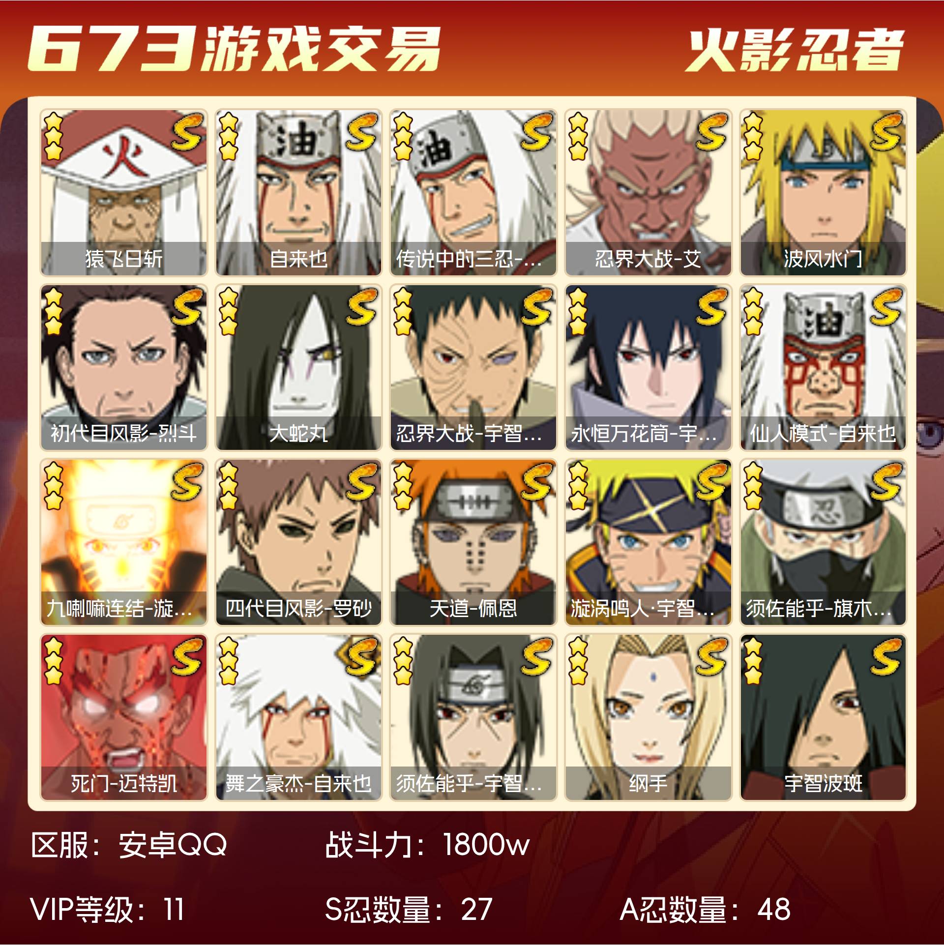 角色等级155 金币1000 战斗力1800w S忍27 A忍48 5星S忍者2 11 段位暗部