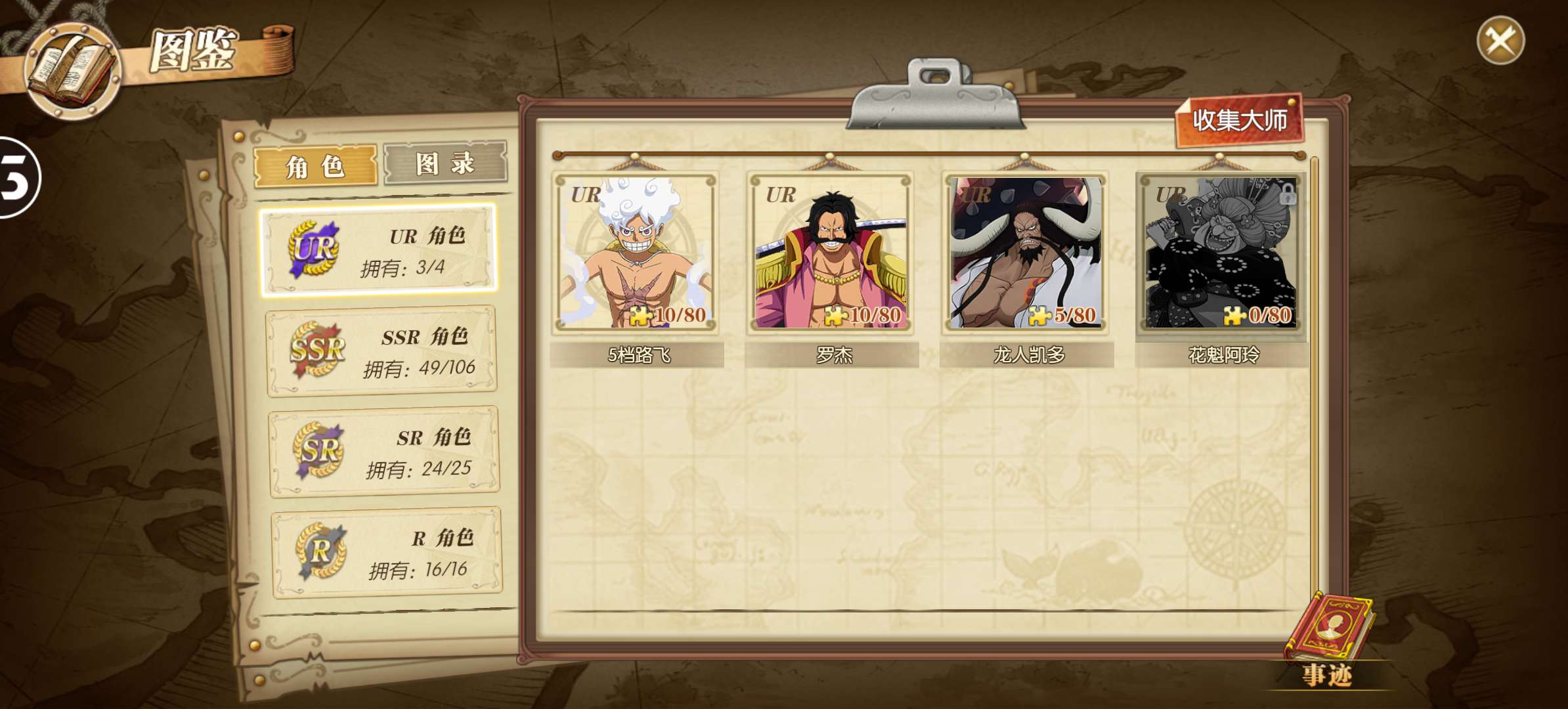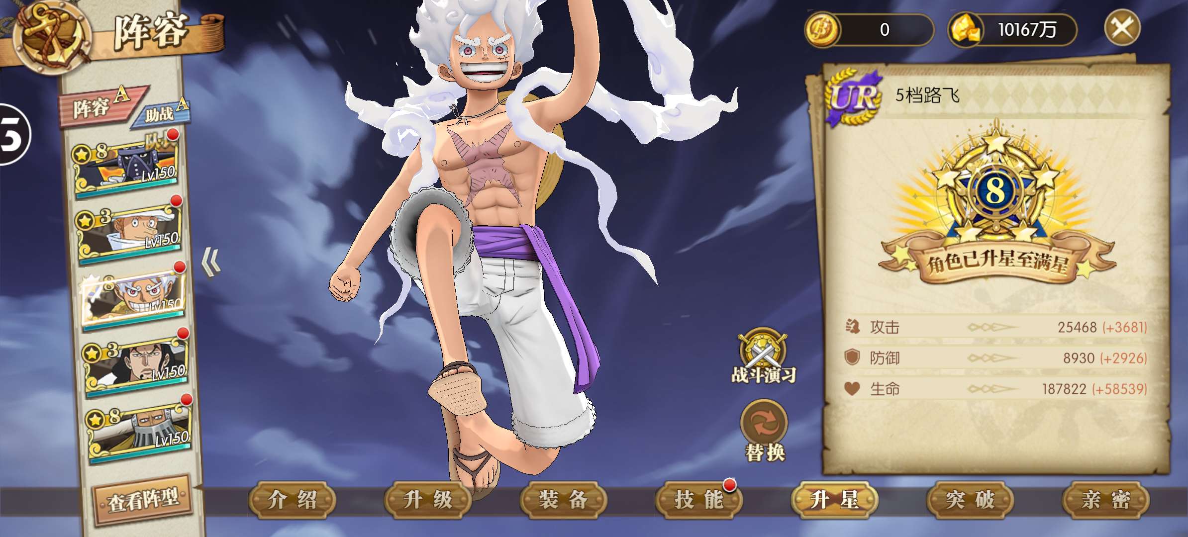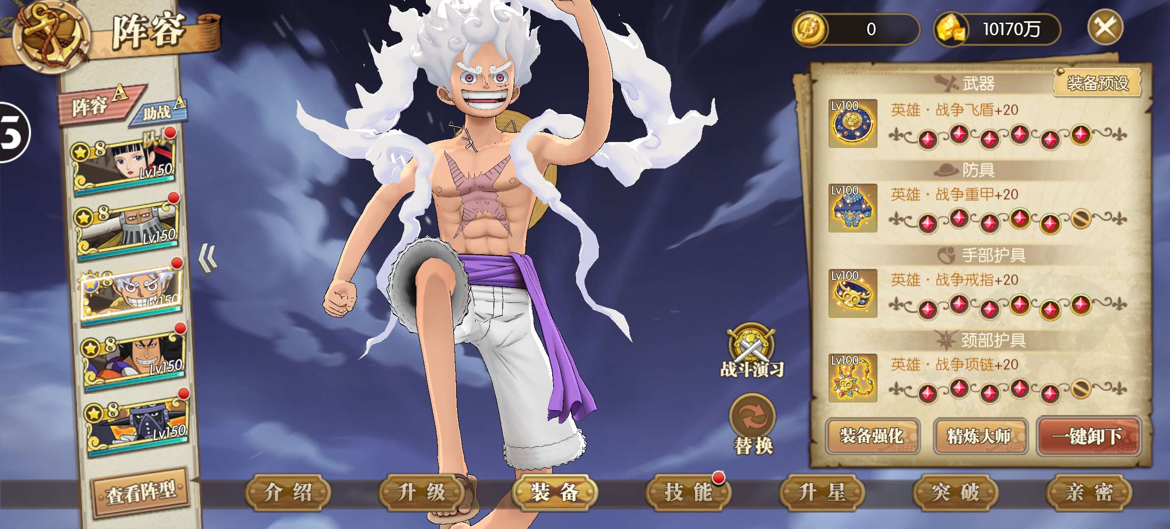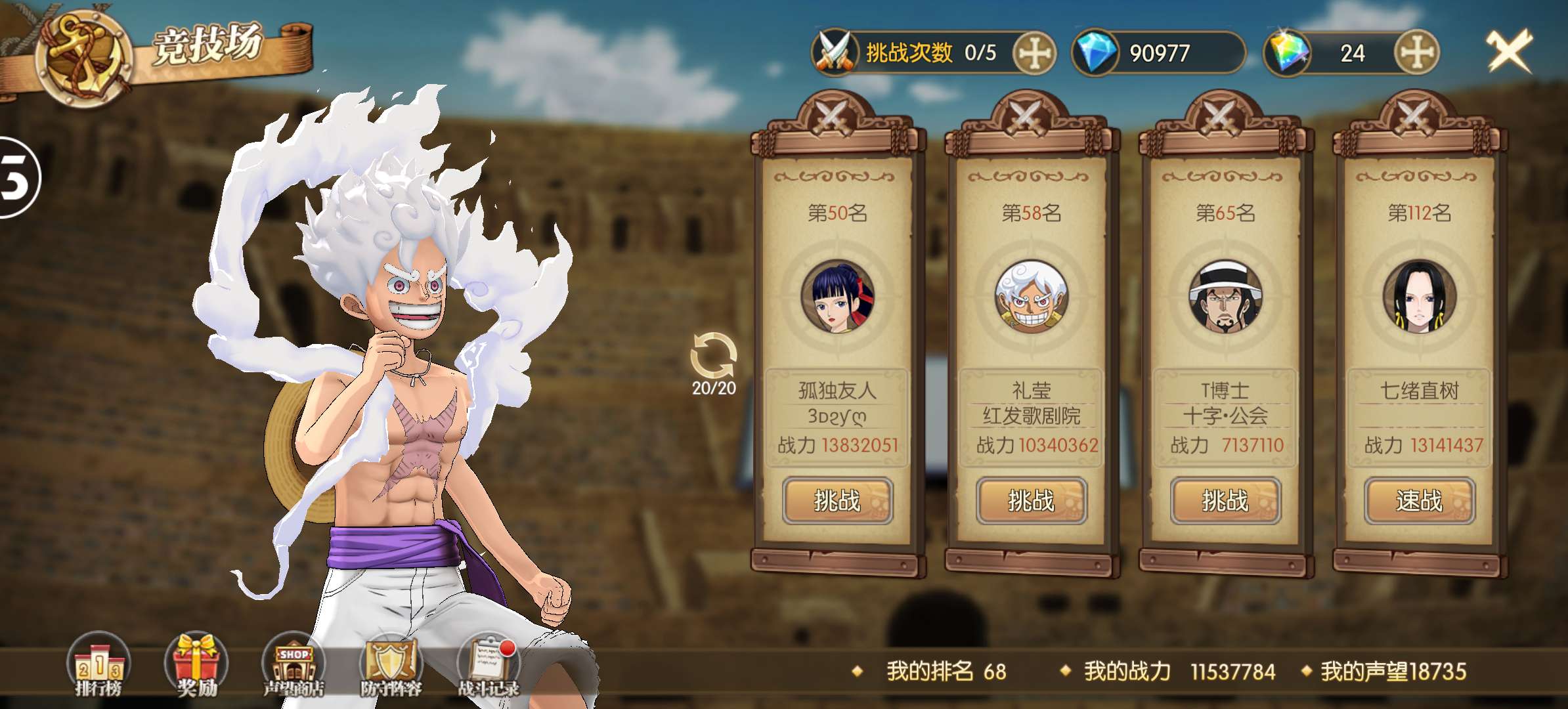已集齐65个角色,超10万蓝钻,竞技场全区排名双榜前100,ur卡5档路飞8星拉满接近1000速