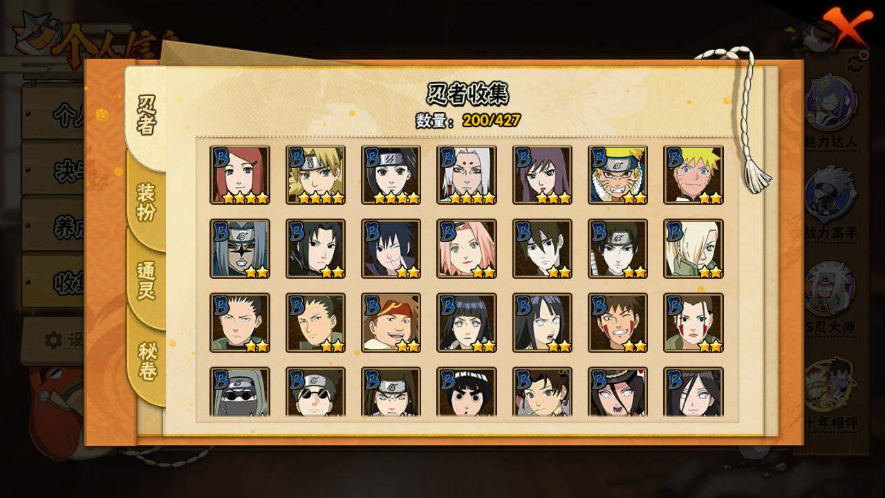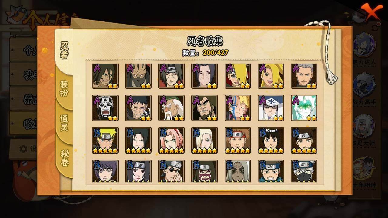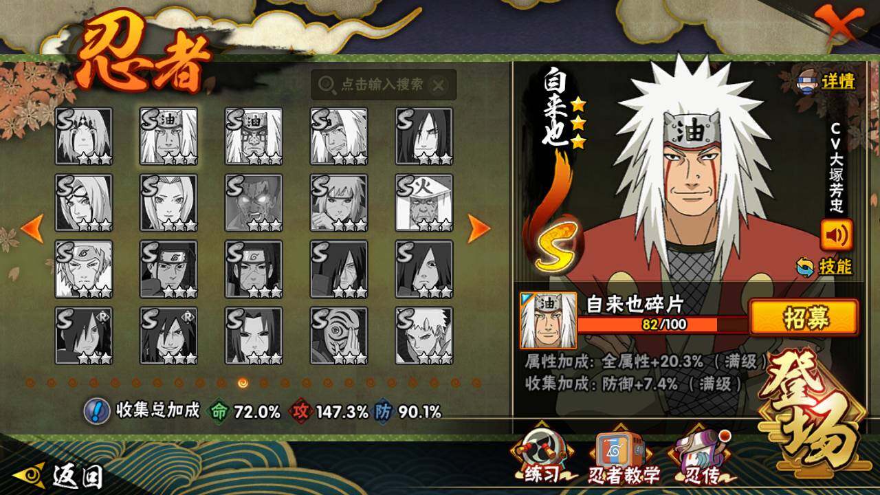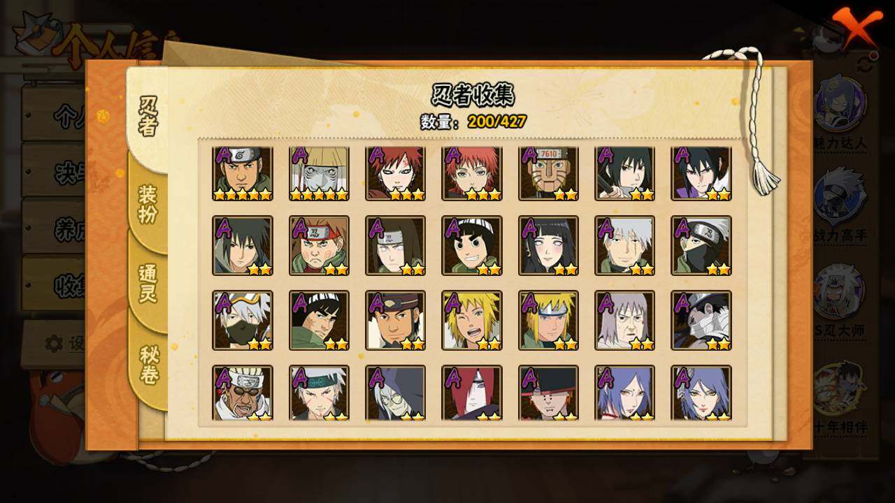 【S级忍者】:猿飞日斩「秽土转生」(3星),千手扉间「秽土转生」(3星),宇智波斑「秽土转生·解」(3星),宇智波带土「忍界大战」(3星),宇智波鼬「须佐能乎」(3星),宇智波止水「须佐能乎」(3星),旗木卡卡西「须佐能乎」(3星),千手柱间「木叶创立」(3星),自来也「舞之豪杰」(3星)