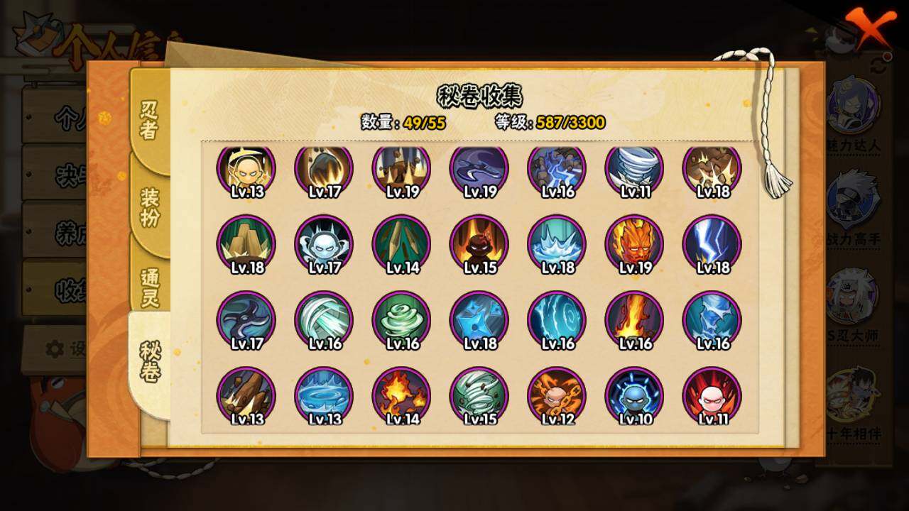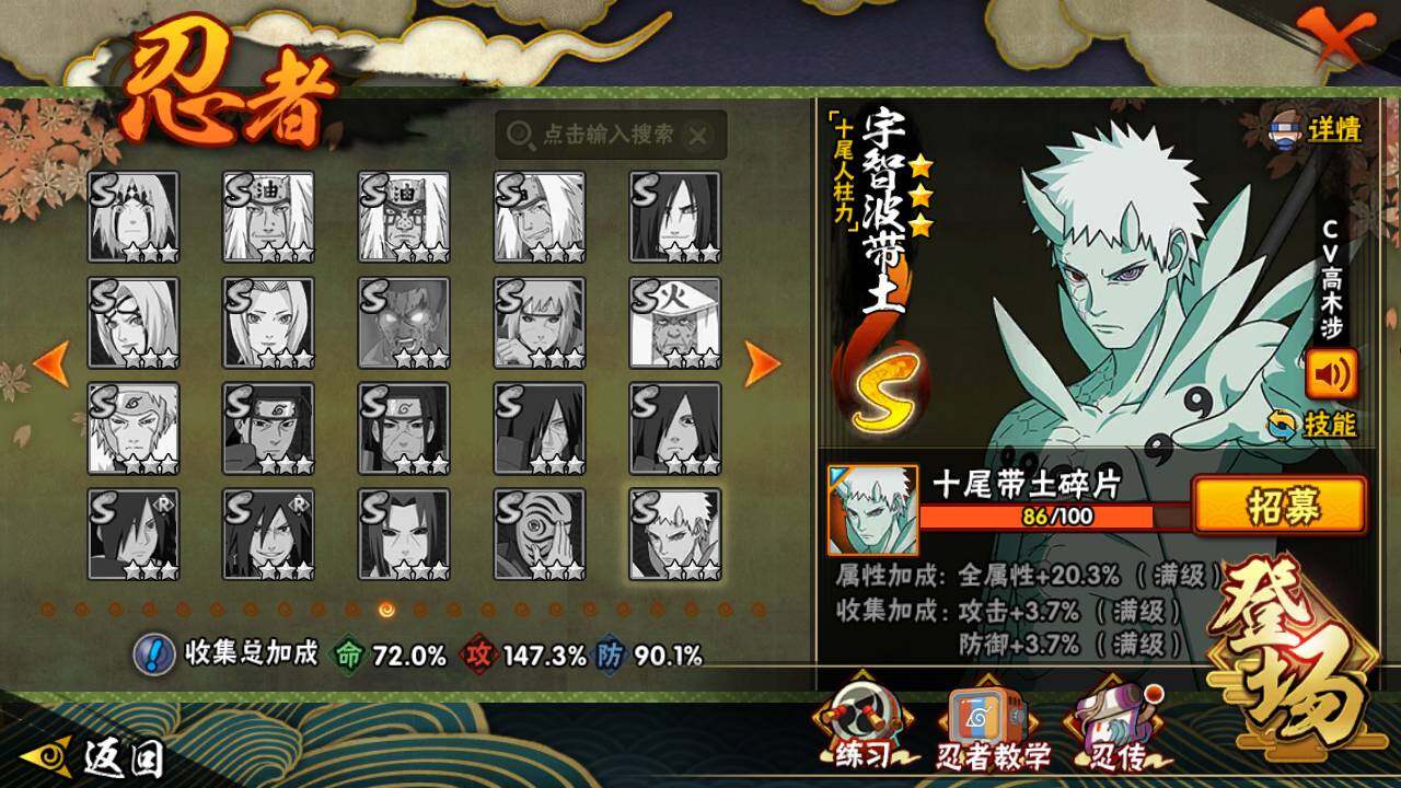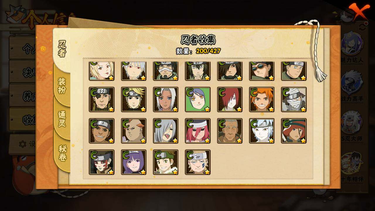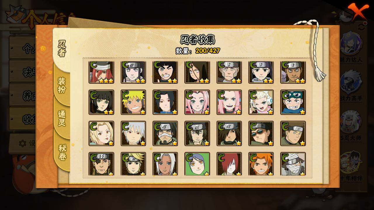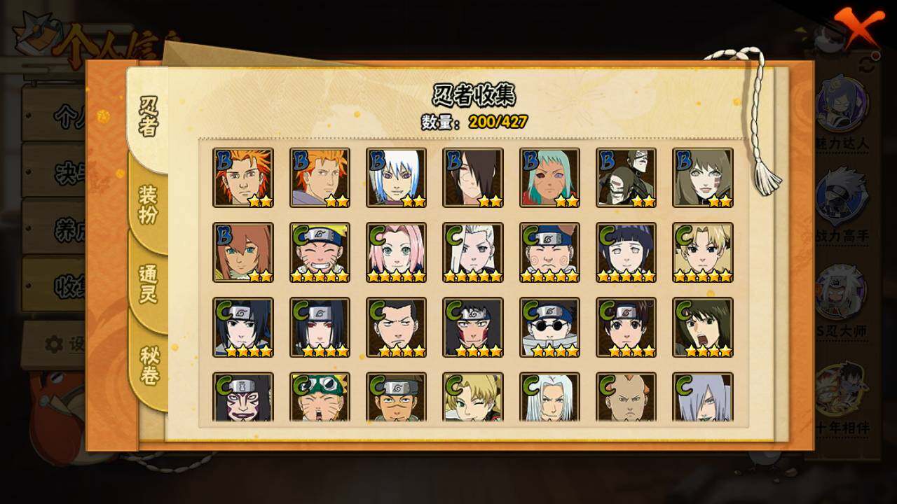 【S级忍者】:猿飞日斩「秽土转生」(3星),千手扉间「秽土转生」(3星),宇智波斑「秽土转生·解」(3星),宇智波带土「忍界大战」(3星),宇智波鼬「须佐能乎」(3星),宇智波止水「须佐能乎」(3星),旗木卡卡西「须佐能乎」(3星),千手柱间「木叶创立」(3星),自来也「舞之豪杰」(3星)