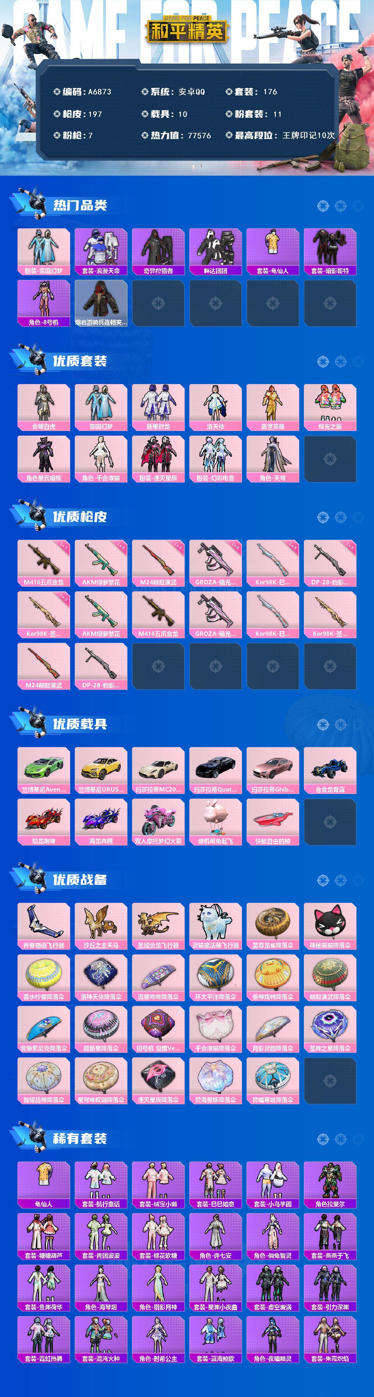 【A6873】安卓 【男神号/兰博基尼Aventador SVJ(翡翠绿)/梦幻火箭头盔(3级)/浪漫天命/10王牌印记】手Q-11粉装-7特效枪-10载具-5粉色飞行器-77576热力值-10王牌印记-176套装-197枪皮