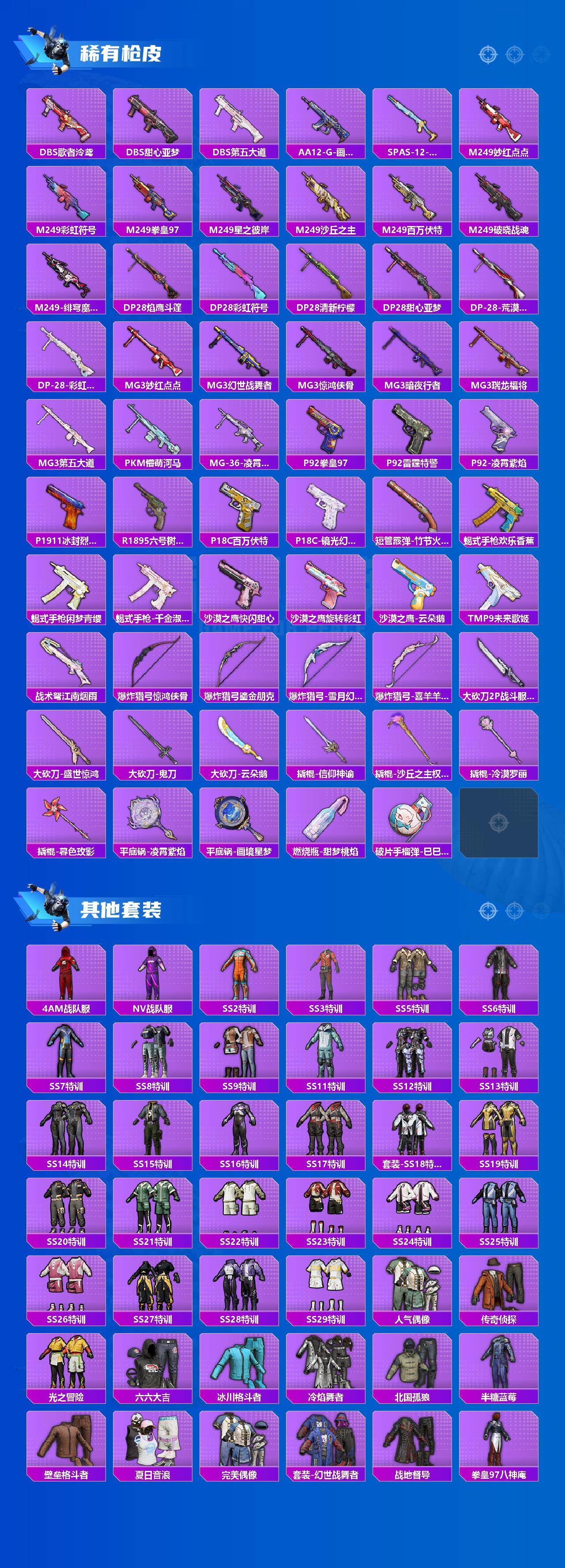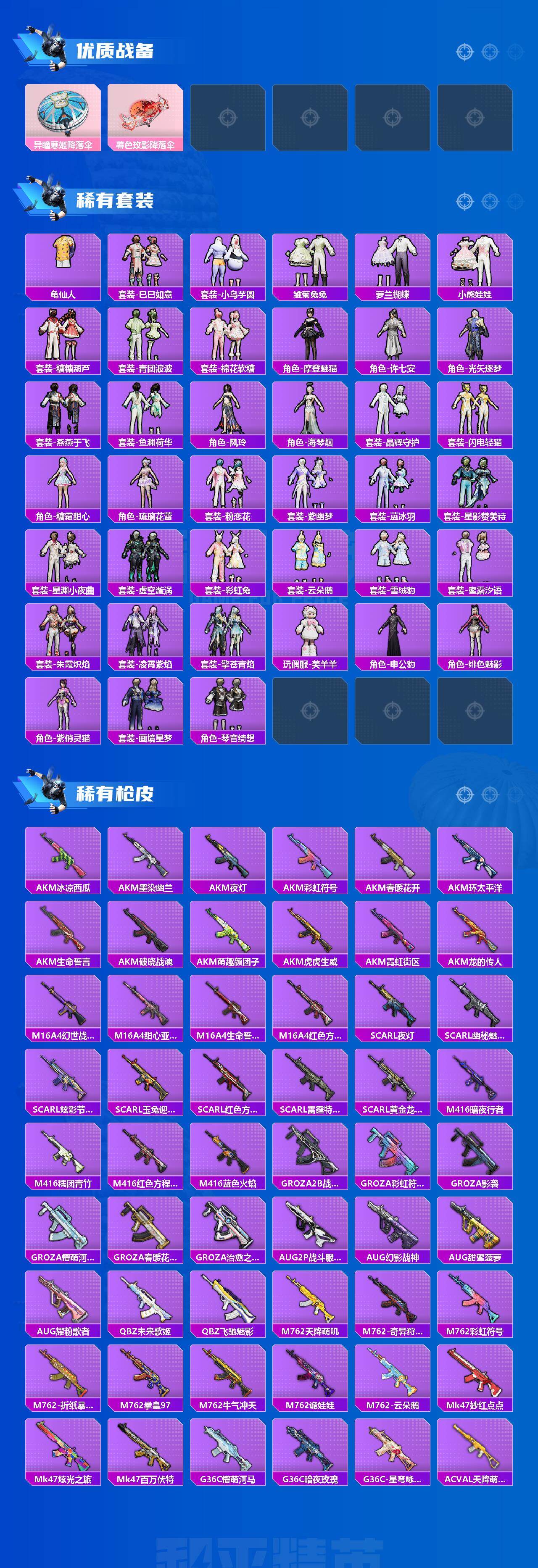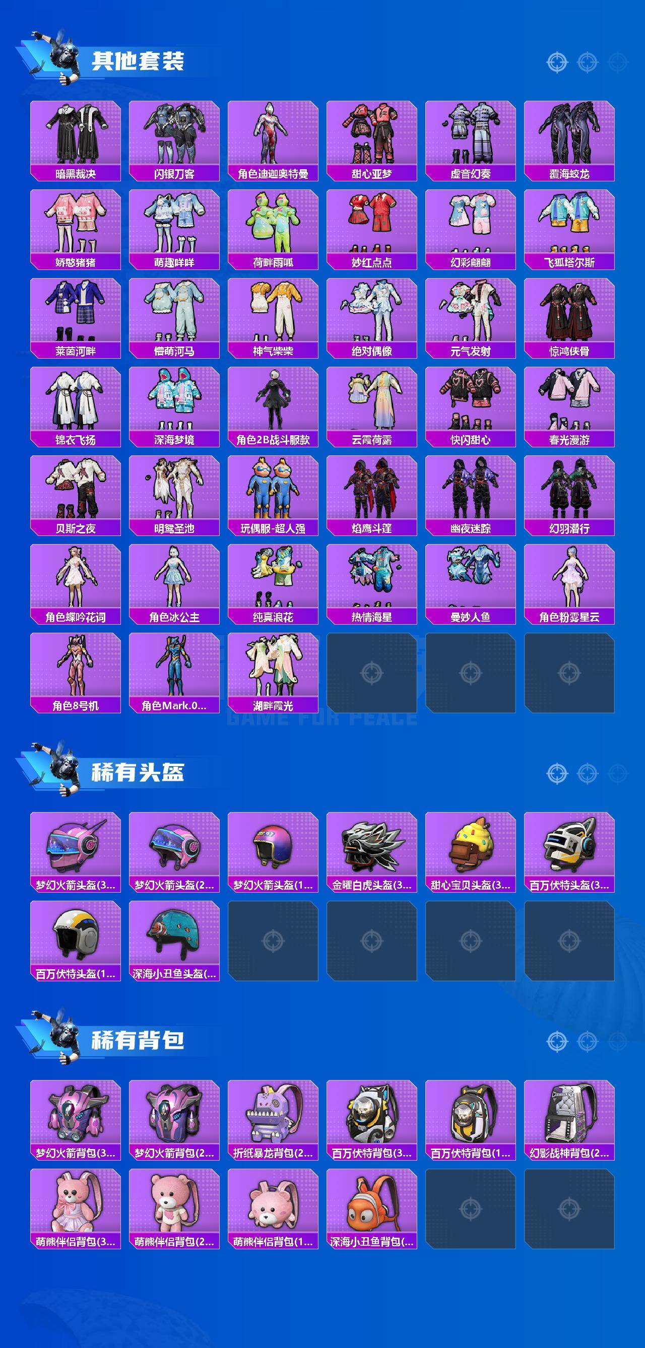 【A6996】苹果【素材号 梦幻火箭/派对舞王/暗影哥特/蓝螳螂/M416-电玩时刻(五级)/M416-墨龙九天(三级)/AUG-星之彼岸(七级)/百万伏特背包/萌熊伴侣背包】 手Q-13粉装-14特效枪-1载具-10粉色飞行器-123411热力值-20王牌印记-269套装-380枪皮