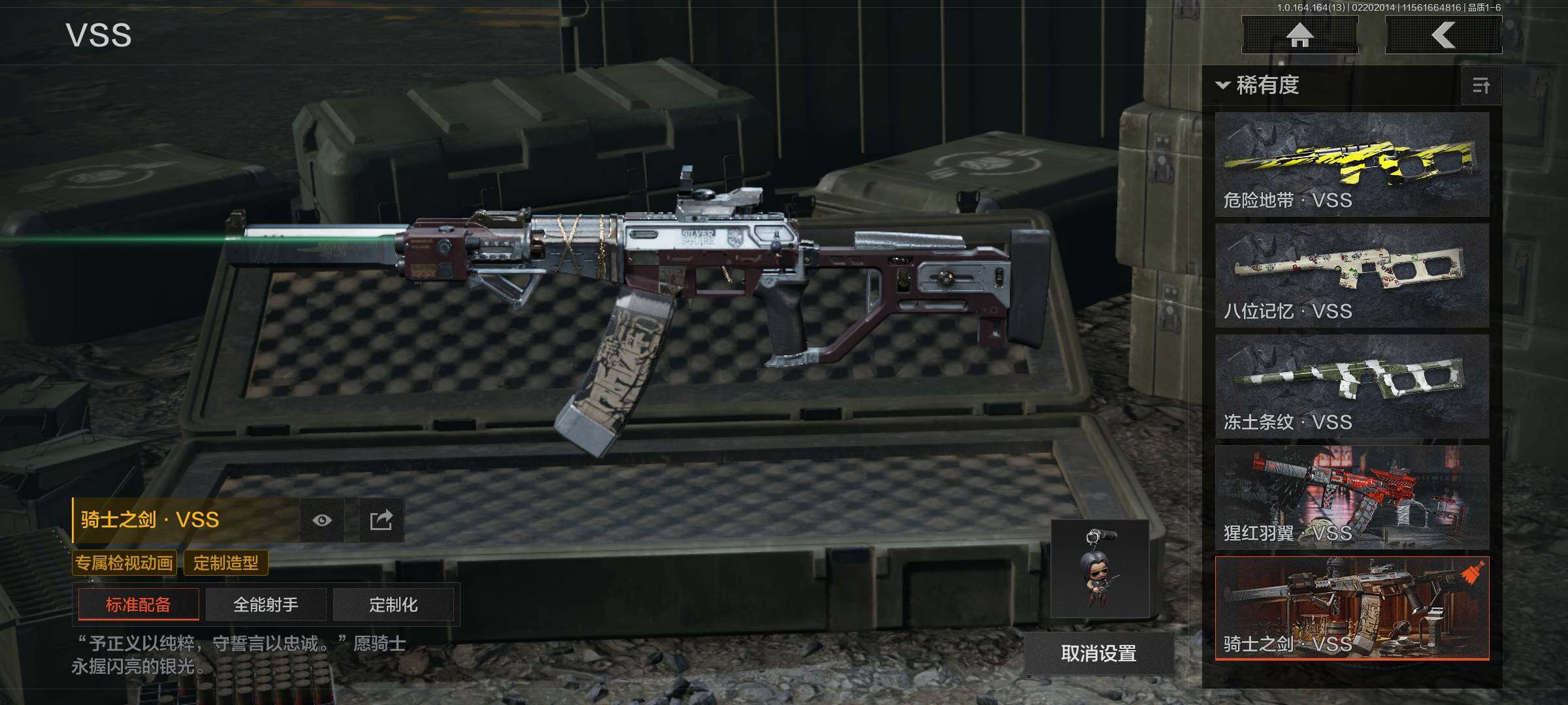 【AQQH594】段位:王牌/仓库价值(百万):2.7/柯恩币:1749/急袭弯刀/下弦月/白蔷薇斯黛拉/骑士之剑VSS/玉擎天工MP5/骑士之剑AX50/骑士典范艾尔熙德