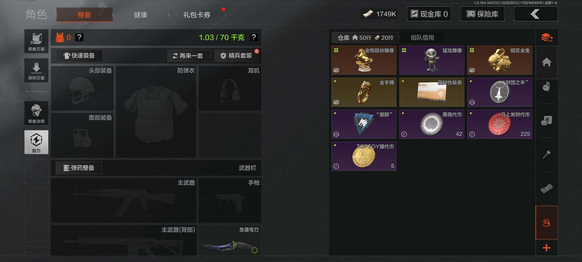 仓库价值(百万):2.7/柯恩币:1749/急袭弯刀/下弦月