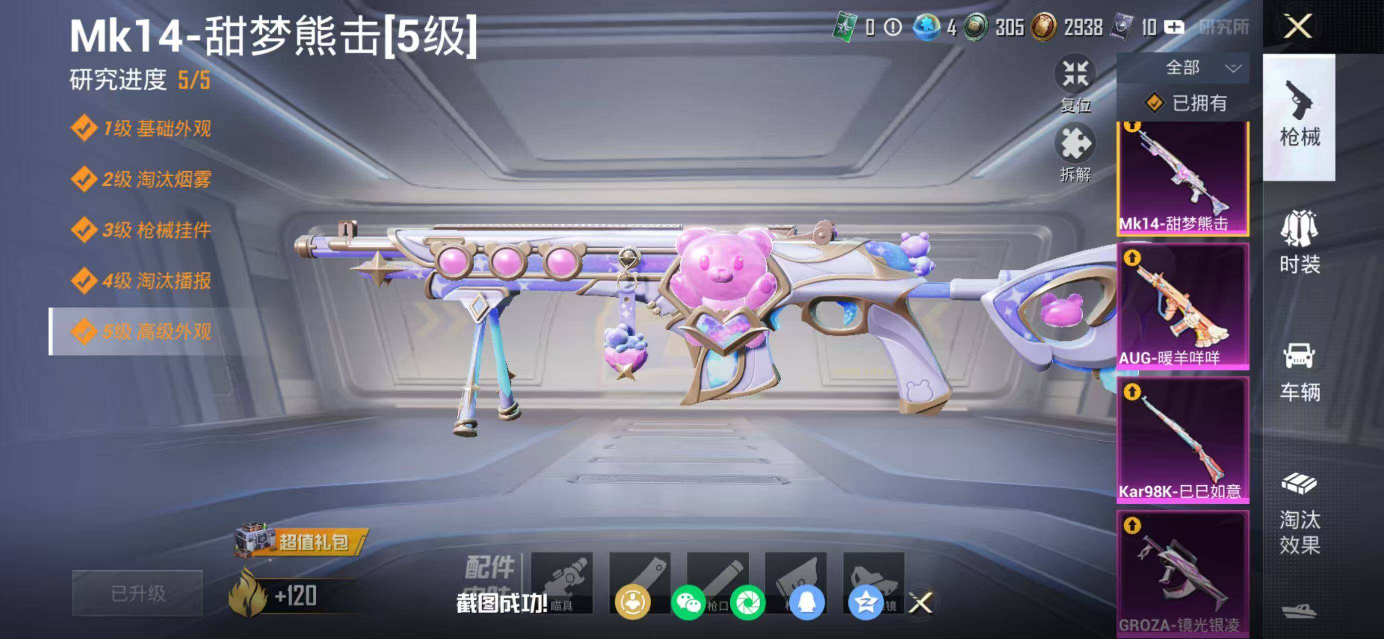 【粉色枪皮等级】:GROZA-镜光银凌(五级),AUG-暖羊咩咩(五级),Kar98K-巳巳如意(五级),Mk14-甜梦熊击(五级),DP-28-豹影疾电(五级)