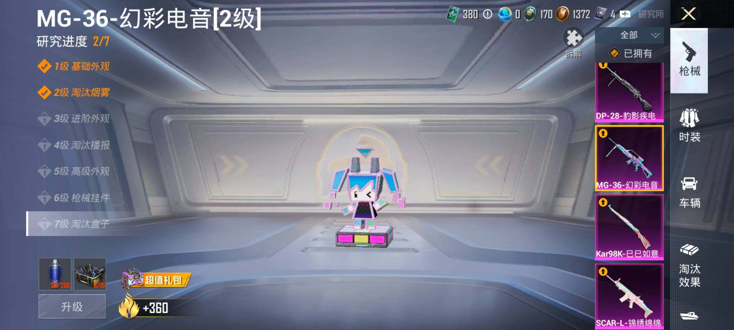 【4特效枪】 SCAR-L-锦绣绵绵 (5级) Kar98K-巳巳如意 (2级) MG-36-幻彩电音 (2级) DP-28-豹影疾电 (4级)