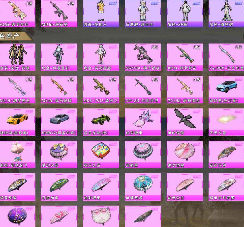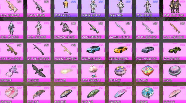 【粉色枪皮等级】:AKM-绿萝繁花(五级),M416-超新星(三级),GROZA-镜光银凌(五级),AUG-暖羊咩咩(五级),AKS-74U-森灵之息(五级),Kar98K-巳