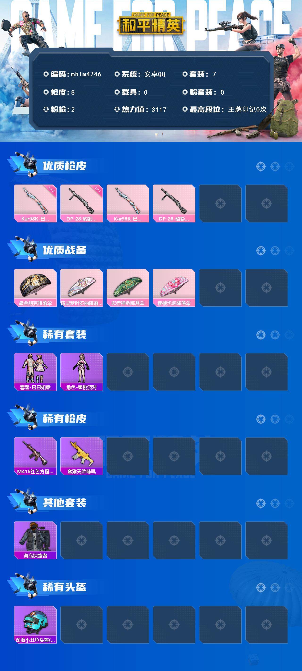 【mhlm4246】安卓 手Q-0粉装-2特效枪-0载具-0粉色飞行器-3117热力值-0王牌印记-7套装-8枪皮