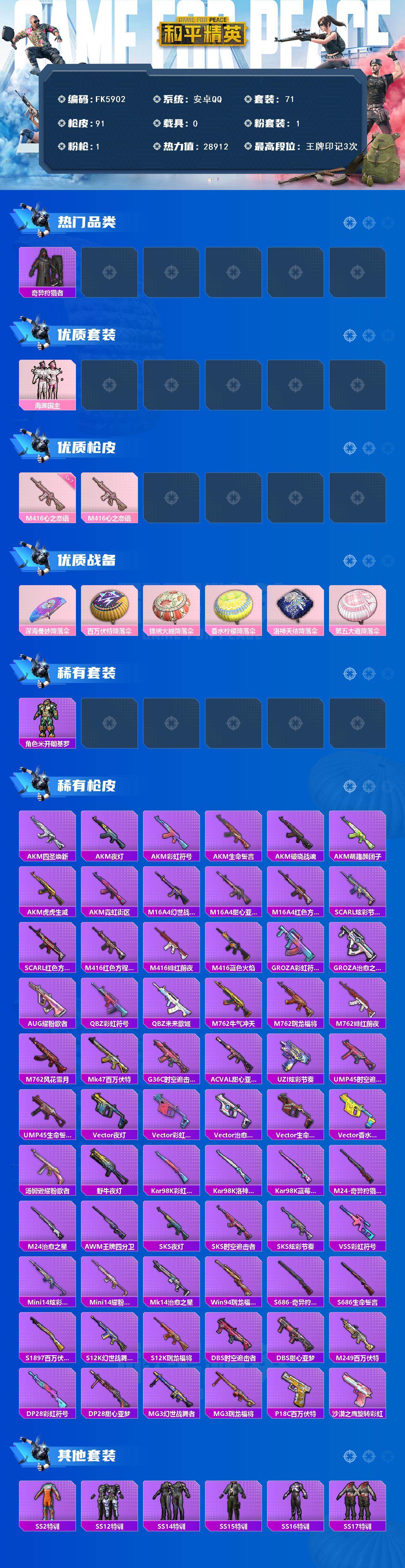 【FK5902】71套装/枪械1/装备104/战备67/王牌印记3/热力值28