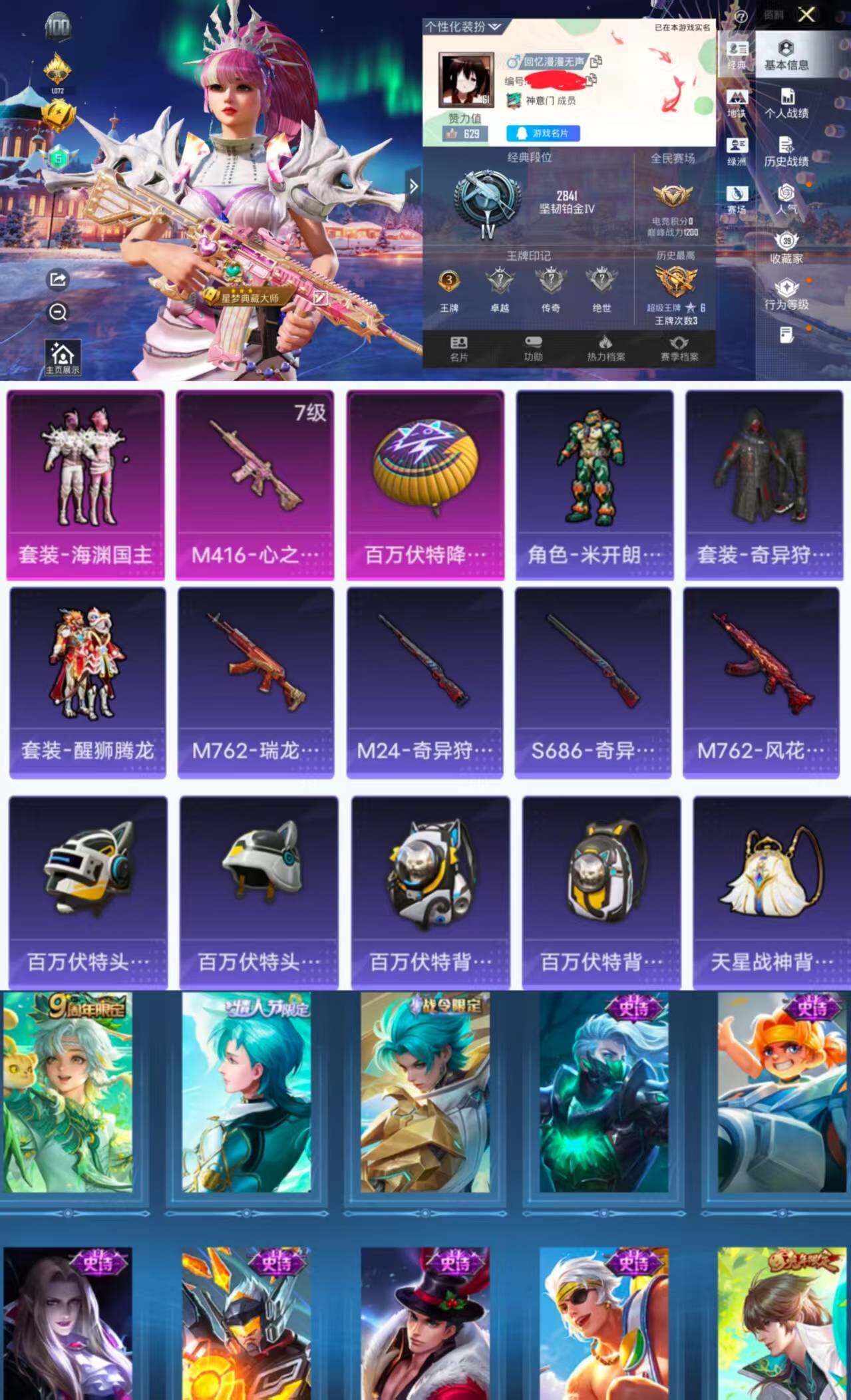 【FK5902】71套装/枪械1/装备104/战备67/王牌印记3/热力值28912/七级M416-心之恋语/奇异狩猎者/海渊国主/M416-心之恋语/深海曼妙降落伞/百万伏特降落伞/锦绣火鲤降落伞/香水柠檬降落伞/洛神天依降落伞/第五大道降落伞/套装-雪国风尚/角色-米开朗基罗/AKM-四圣焕新/AKM-夜灯/AKM-彩虹符号/AKM-生命誓言/AKM-破晓战魂/AKM-萌趣颜团子/AKM-虎