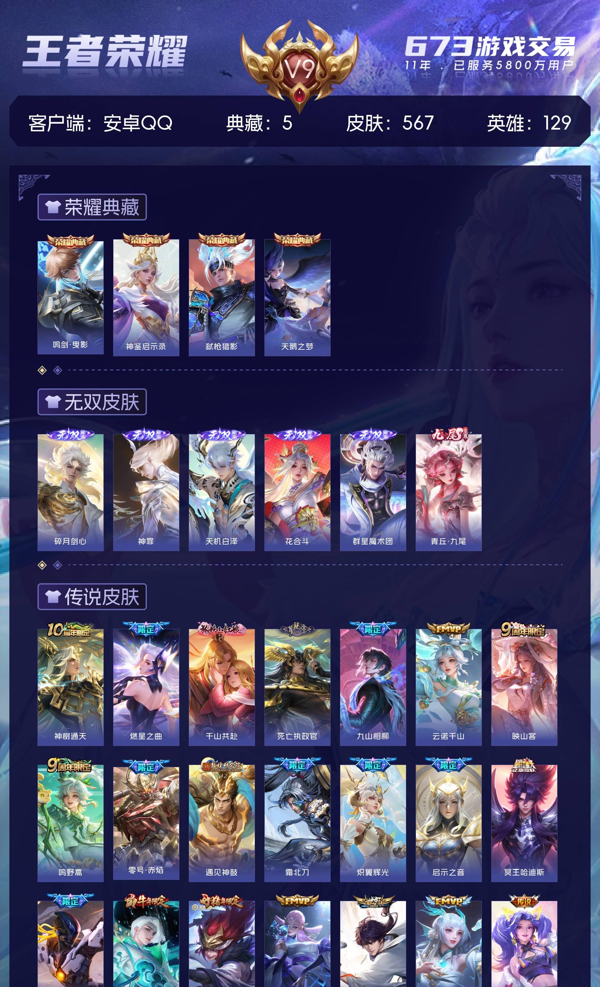 安卓QQ/至尊星耀/567皮肤/129英雄/4典藏/0珍品无双/6无双/0珍品传说/85传说/191