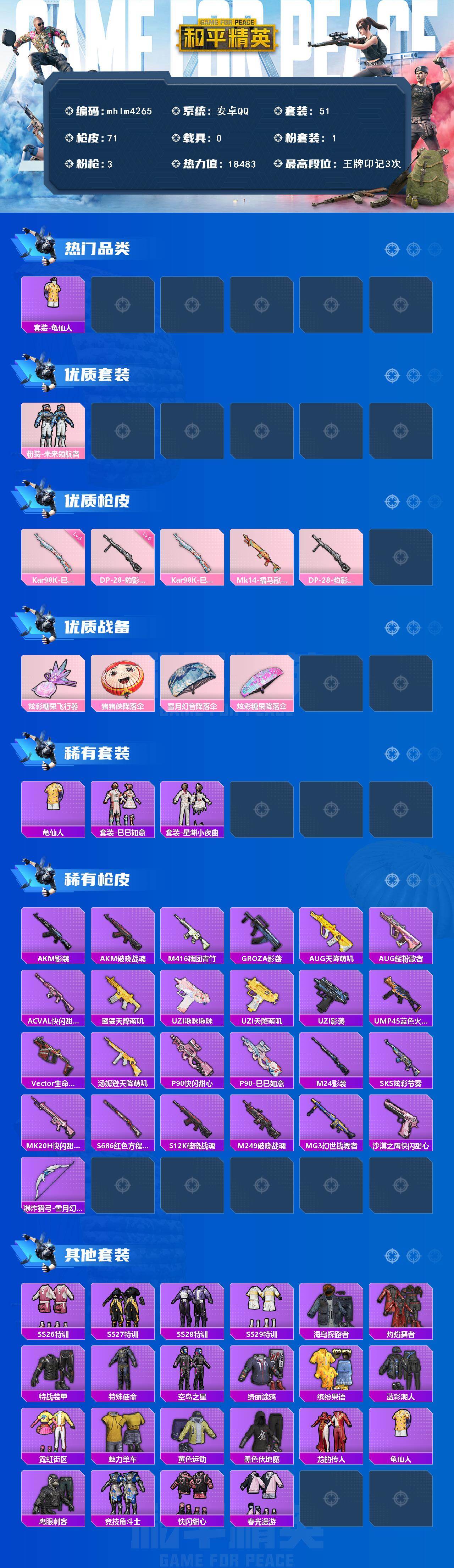 【mhlm4265】安卓 手Q-1粉装-3特效枪-0载具-1粉色飞行器-18483热力值-3王牌印记-51套装-71枪皮