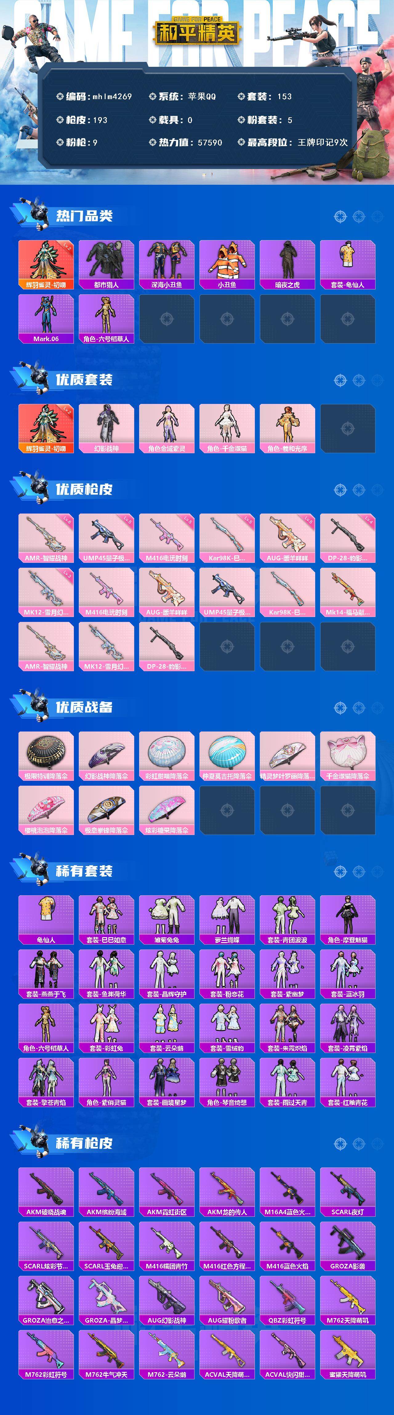 【mhlm4269】苹果 手Q-1神装-5粉装-9特效枪-0载具-0粉色飞行器-57590热力值-9王牌印记-153套装-193枪皮