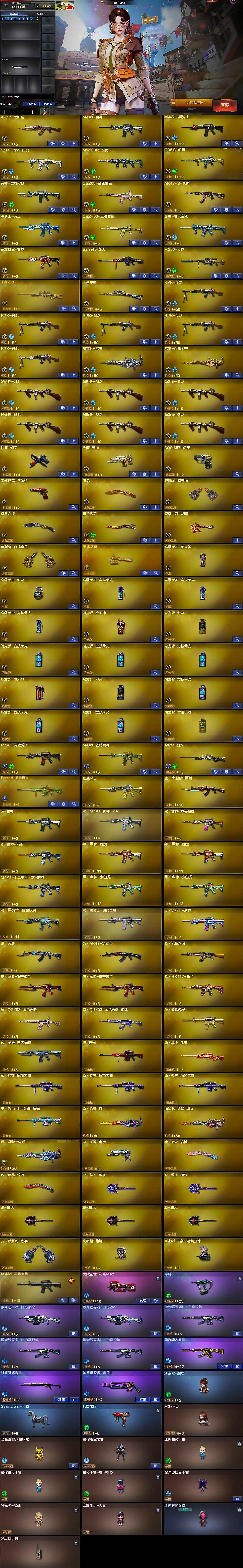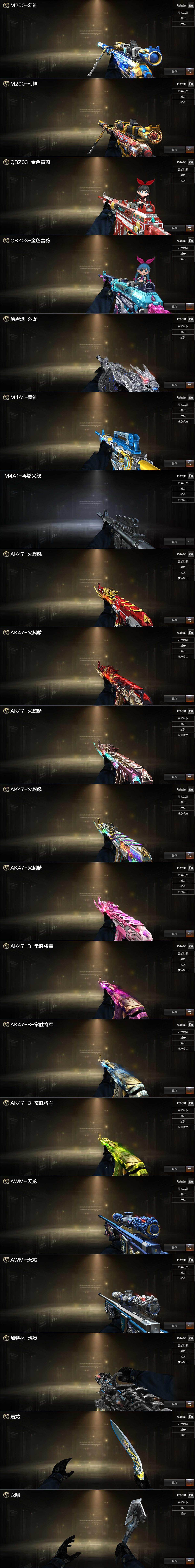 【热门武器】:G36C-幻影,QBZ03-金色蔷薇,M14EBR-玄武,Scar Light-白虎,M200-幻神,死亡之眼,荣耀世冠-雷神,白虎-电玩蓝兔,荣耀世冠-柯尔特,毒蜂,M4A1-黑骑士,汤姆逊-烈龙*6,RPK-盘龙*5,加特林-炼狱,斯泰尔-蝴蝶,火麒麟-绝迹,COP 357-幻灵,沙鹰-修罗,炽芒蝶刃,荣耀