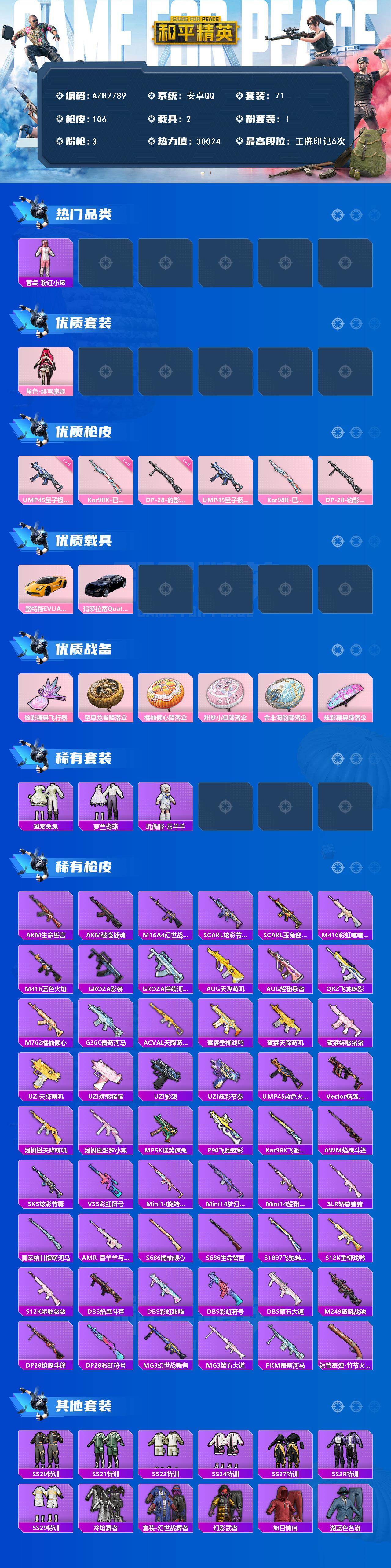 【AZH2789】安卓 手Q【绯穹魔姬 俏皮奶喵 兔兔白日梦 2载具】1粉装-3特效枪-2载具-1粉色飞行器-30024热力值-6王牌印记-71套装-106枪皮