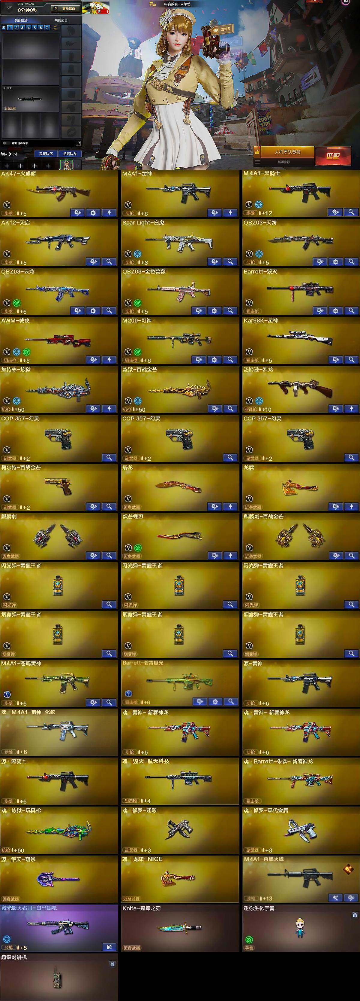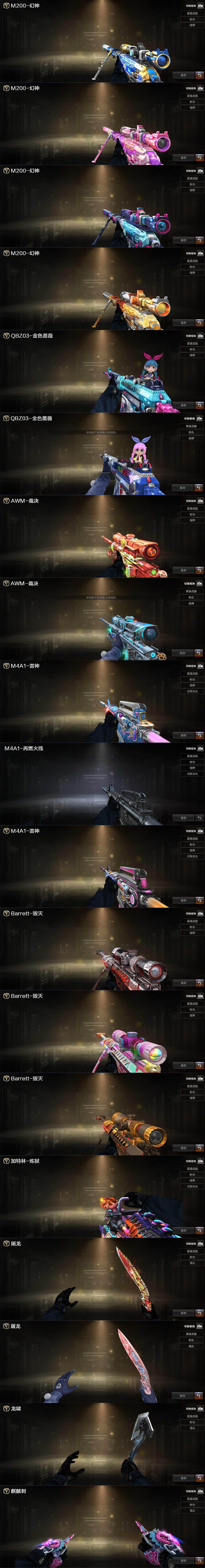 【热门武器】:QBZ03-金色蔷薇,Scar Light-白虎,M200-幻神,Kar98K-星神,M4A1-黑骑士,汤姆逊-烈龙,加特林-炼狱,COP 357-幻灵*3,Knife-冠军之刃,炽芒蝶刃