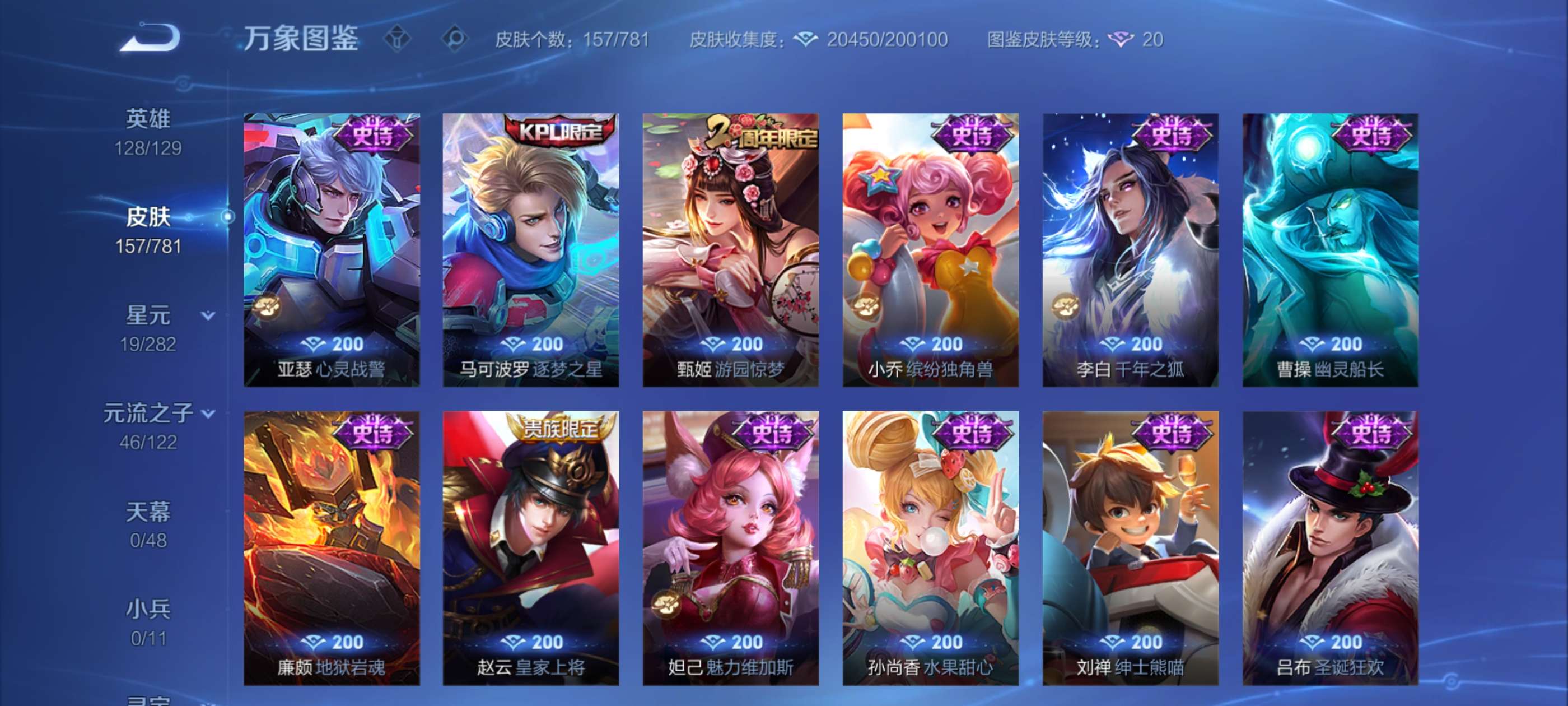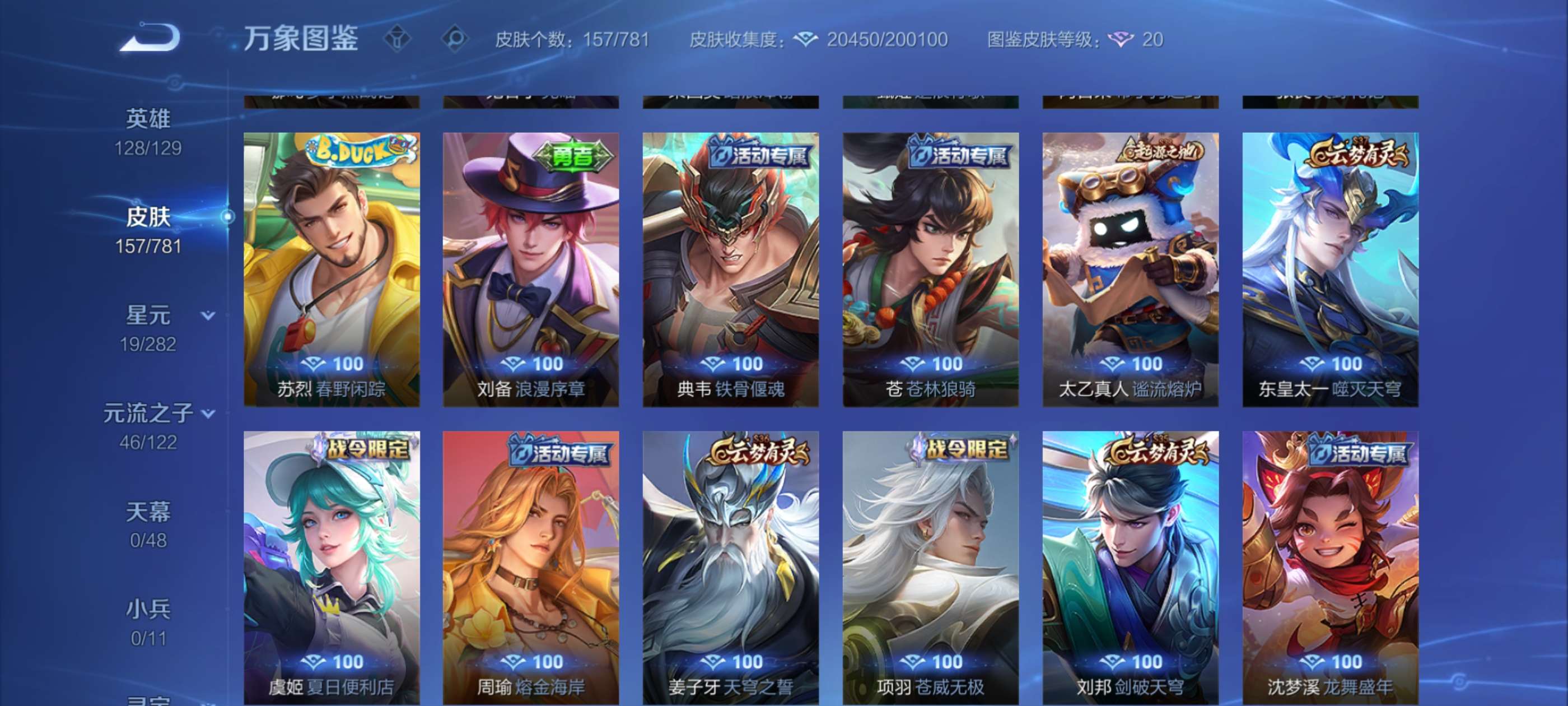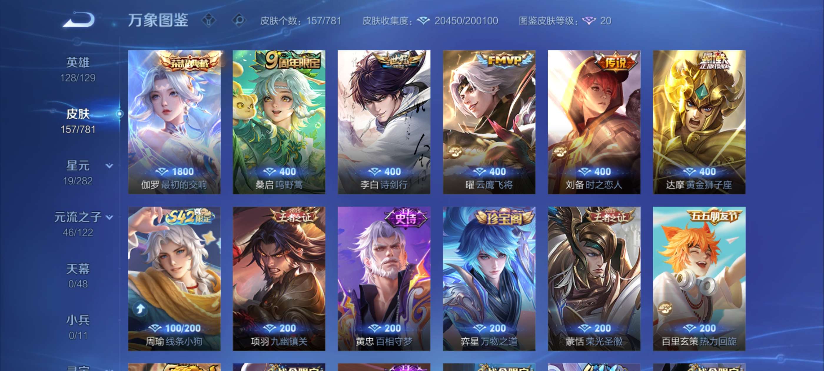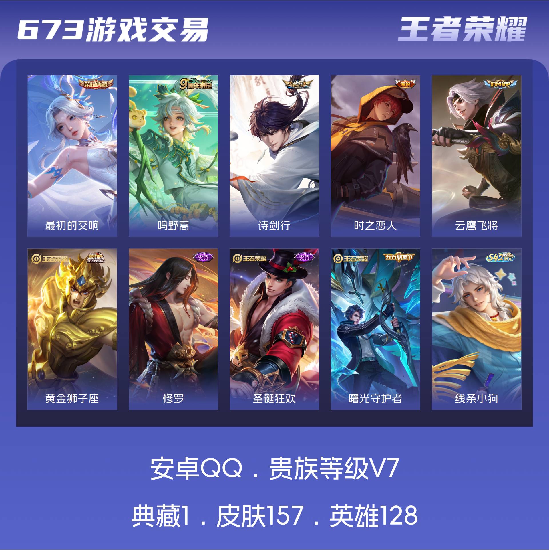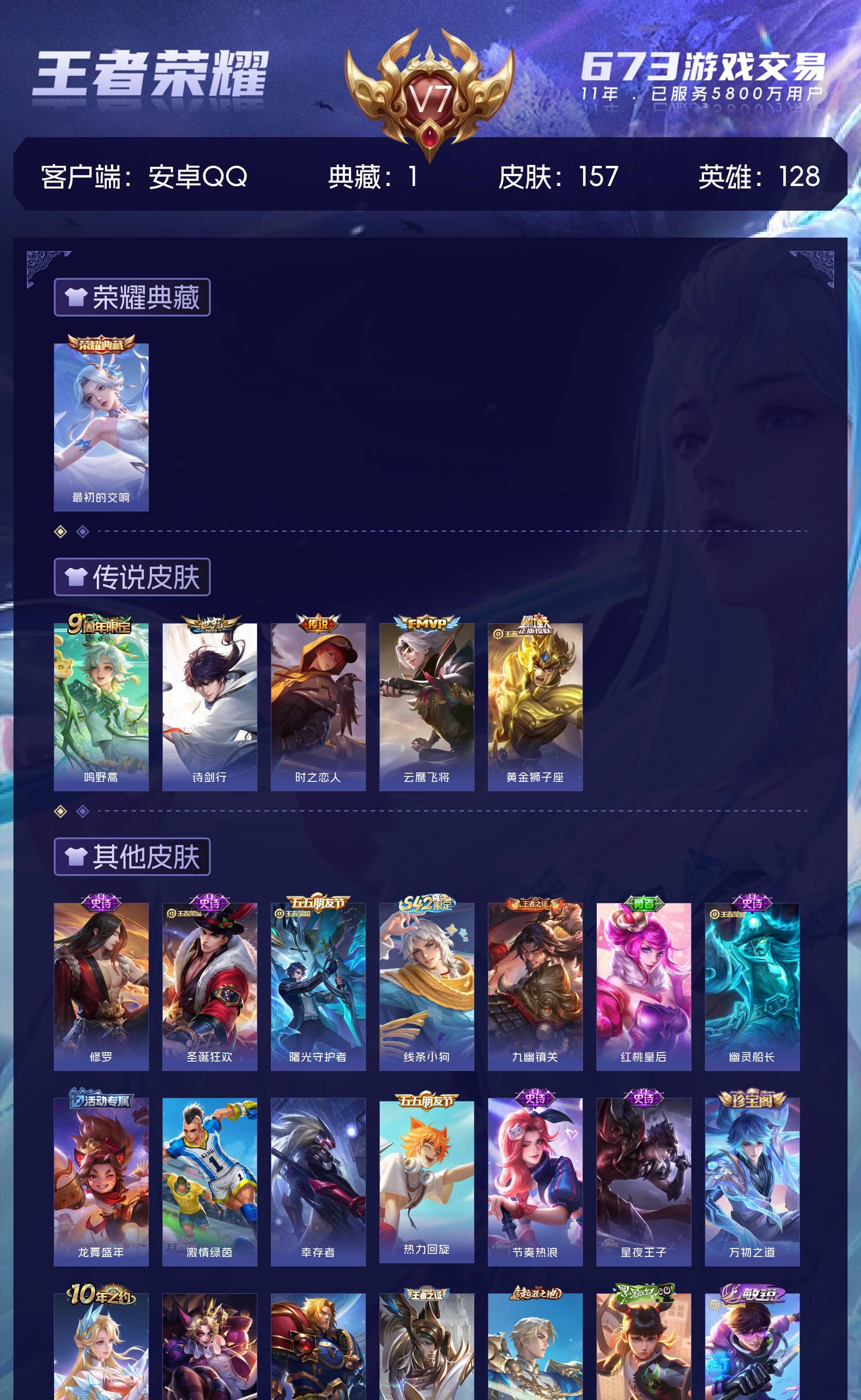 V7 皮肤157 英雄128 至尊星耀 荣耀典藏1 星传说1 传说5 其他皮肤157