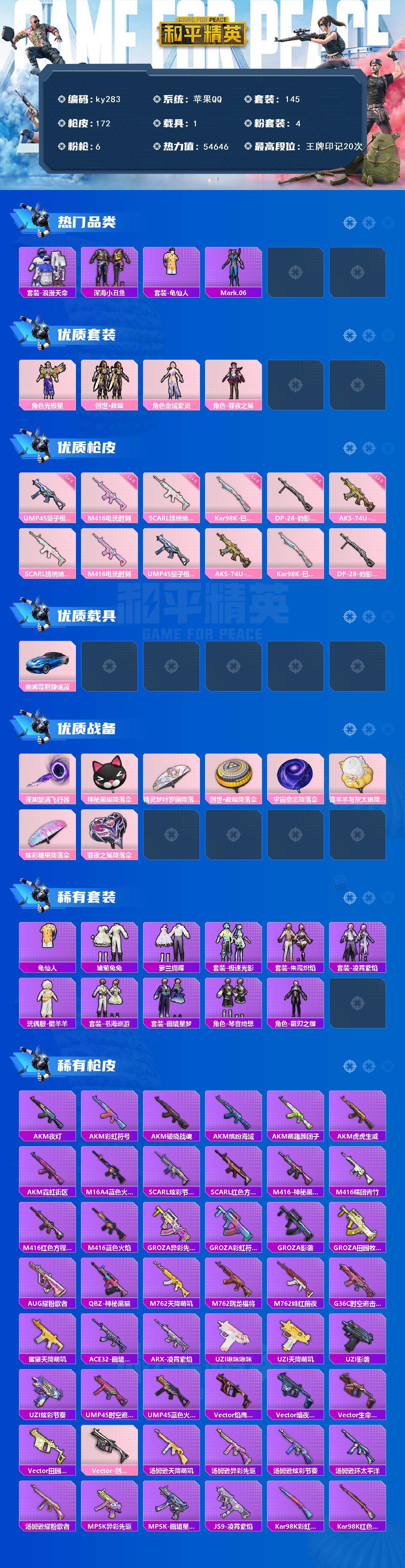 苹果 手Q-4粉装-6特效枪-1载具-1粉色飞行器-54646热力值-20王牌印记-145套装-172枪皮