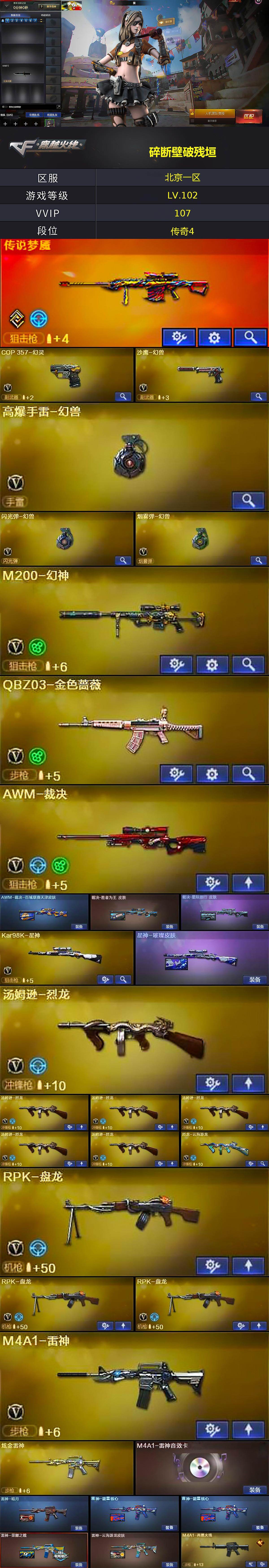 【热门武器】:传说梦魇,QBZ03-金色蔷薇,HK417-朱雀,M200-幻神,八面凌龙,死亡之眼,Kar98K-星神,C.A.T,M4A1-黑骑士,汤姆逊-烈龙*6,RPK-盘龙*3,加特林-炼狱,雷神-小红,COP 357-幻灵,沙鹰-修罗*7,高爆手雷-幻兽