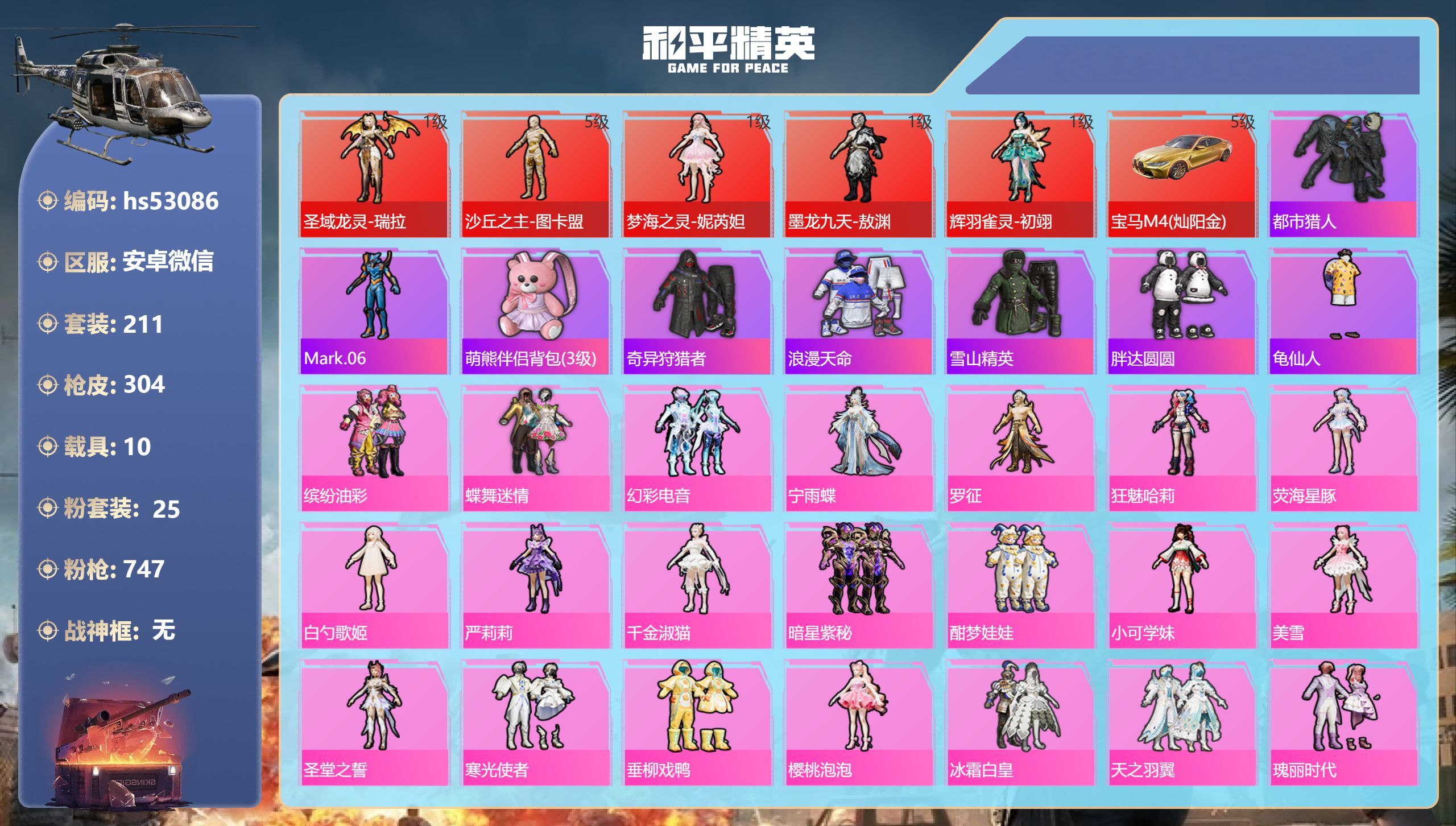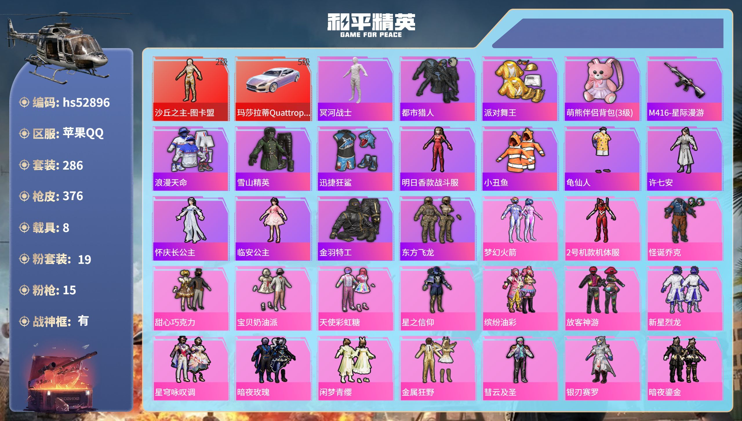 4神装-23粉装-12特效枪-11载具-18粉色飞行器-149596热力值-14王牌印记-290套装-366枪皮