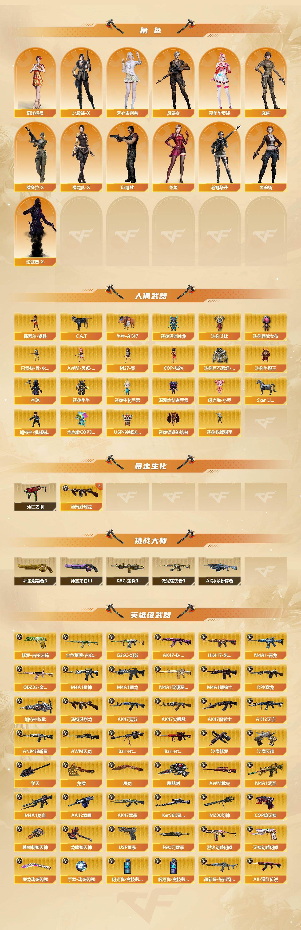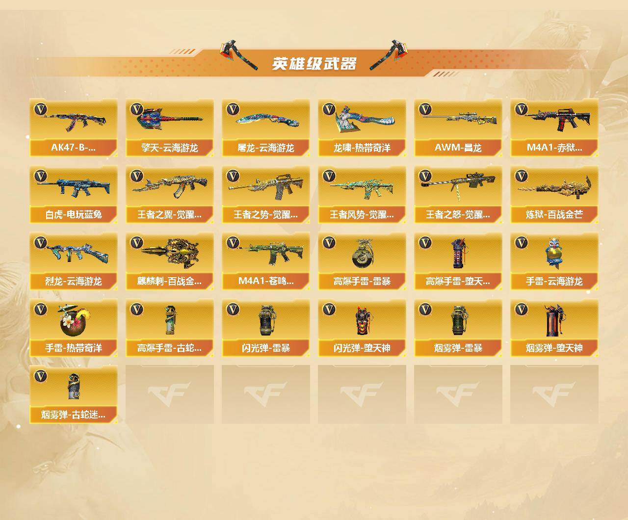 【热门武器】:G36C-幻影,QBZ03-金色蔷薇,HK417-朱雀,M4A1-青龙,M200-幻神,金色蔷薇-古蛇迷踪,修罗-古蛇迷踪,死亡之眼,白虎-电玩蓝兔,Kar98K-星神,金色小号,C.A.T,牛牛-AK47,M4A1-黑骑士,汤姆逊-烈龙*8,RPK-盘龙,加特林-炼狱,斯泰尔-蝴蝶,USP-雷暴,COP-堕天神,沙鹰-修罗*5
