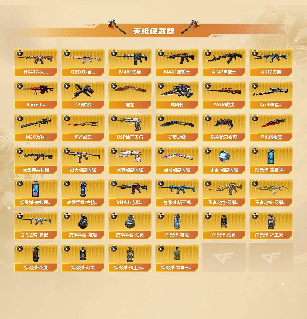 【热门武器】:QBZ03-金色蔷薇,HK417-朱雀*2,M200-幻神,白虎-电玩蓝兔,Kar98K-星神,M4A1-黑骑士*2,金色蔷薇-空,羊驼玩偶*2,沙鹰-修罗,炽芒蝶刃*2