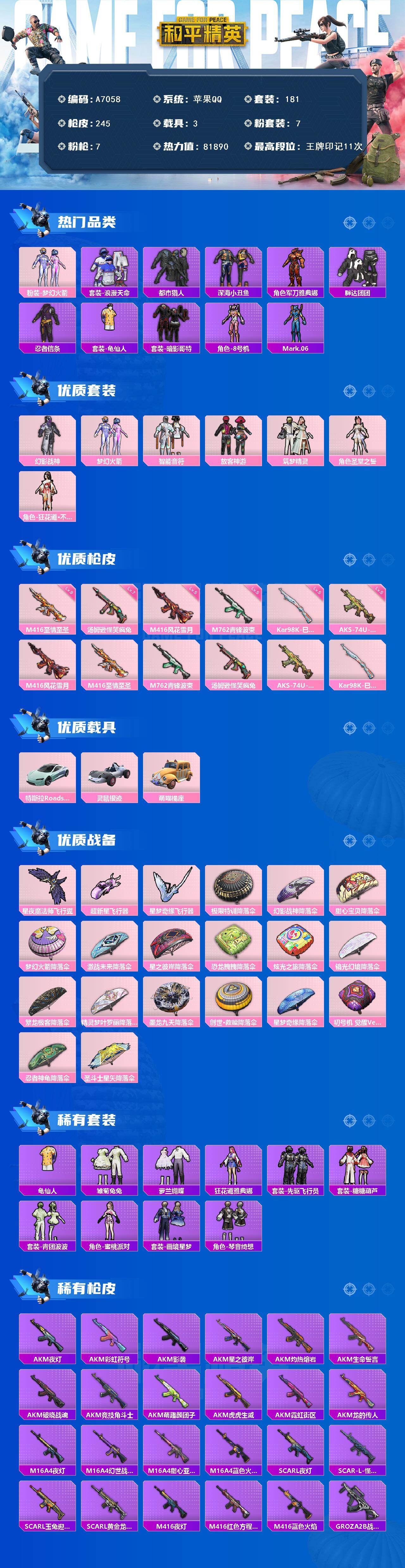 【A7058】苹果 【素材男神号 粉装-梦幻火箭/套装-浪漫天命/套装-都市猎人/套装-深海小丑鱼/角色-军刀雅典娜/套装-胖达团团/套装-忍者信条/套装-龟仙人/套装-暗影哥特/角色-8号机/角色-Mark.06/特斯拉Roadster(水滴蓝)/灵鼠银迹/萌喵橘座/M416-风花雪月(五级)/M416-至情至圣(九级)/M762-青锋波束(五级)】手Q-7粉装-7特效枪-3载具-3粉色飞行器-81890热力值-11王牌印记-181套装-245枪皮