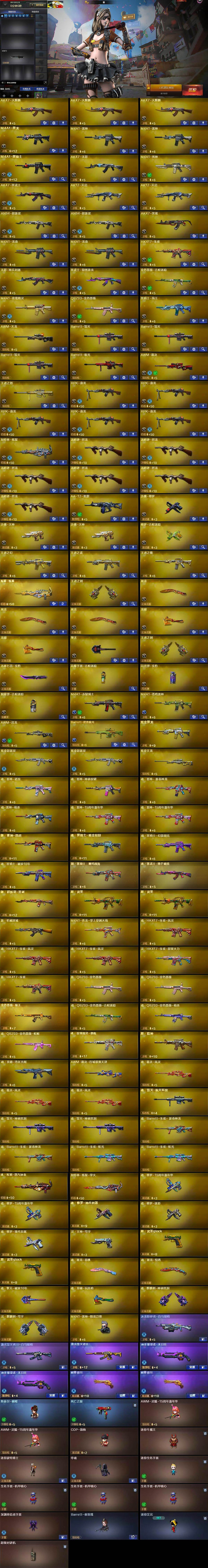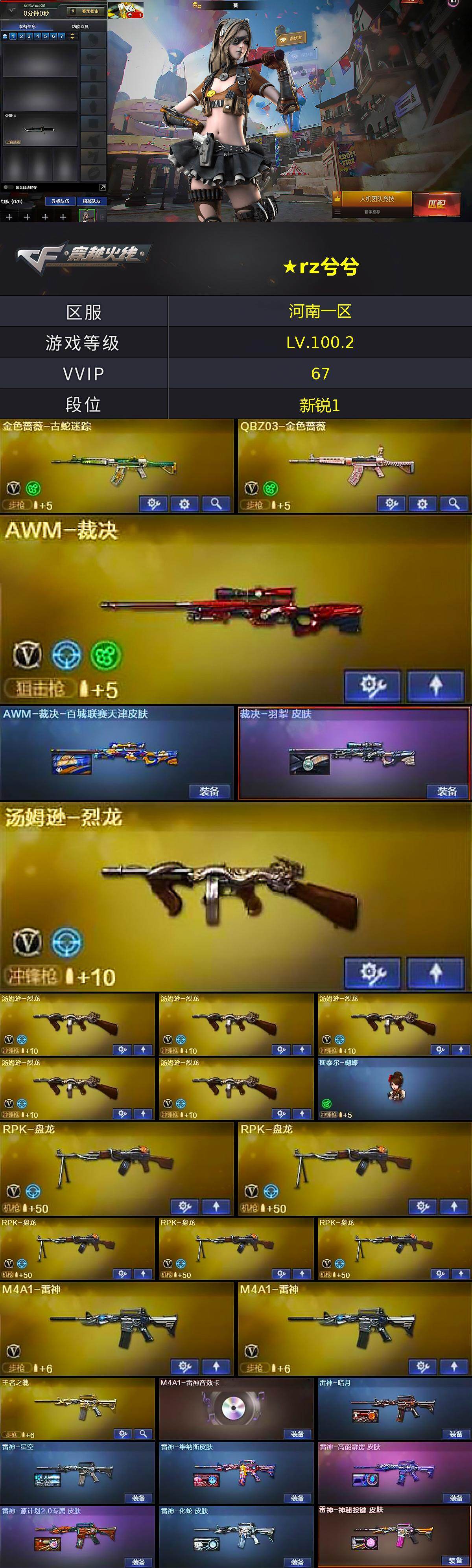 【热门武器】:QBZ03-金色蔷薇,HK417-朱雀,金色蔷薇-古蛇迷踪,修罗-古蛇迷踪,死亡之眼,M4A1-黑骑士,汤姆逊-烈龙*6,RPK-盘龙*5,加特林-炼狱,斯泰尔-蝴蝶,沙鹰-修罗