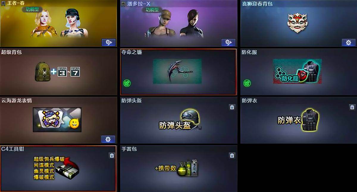 【道具】:喜狮迎春背包,超级背包,夺命之镰,防化服,云海游龙表情,防弹头盔,防弹衣,C4工具钳,手雷包