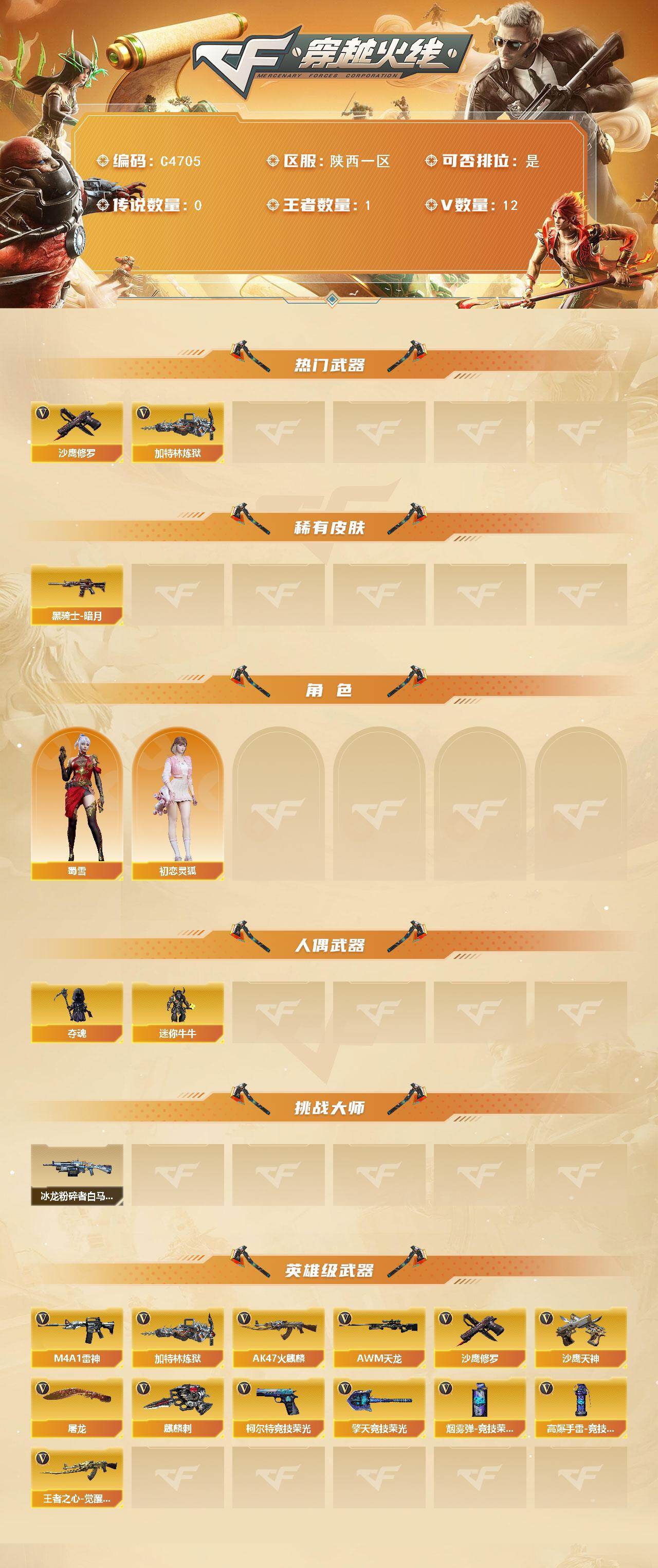 【C4705】陕西一区-13V-1王者武器数-0炫金武器数
