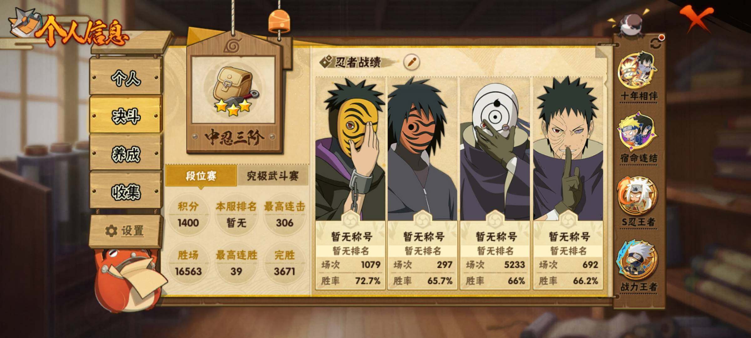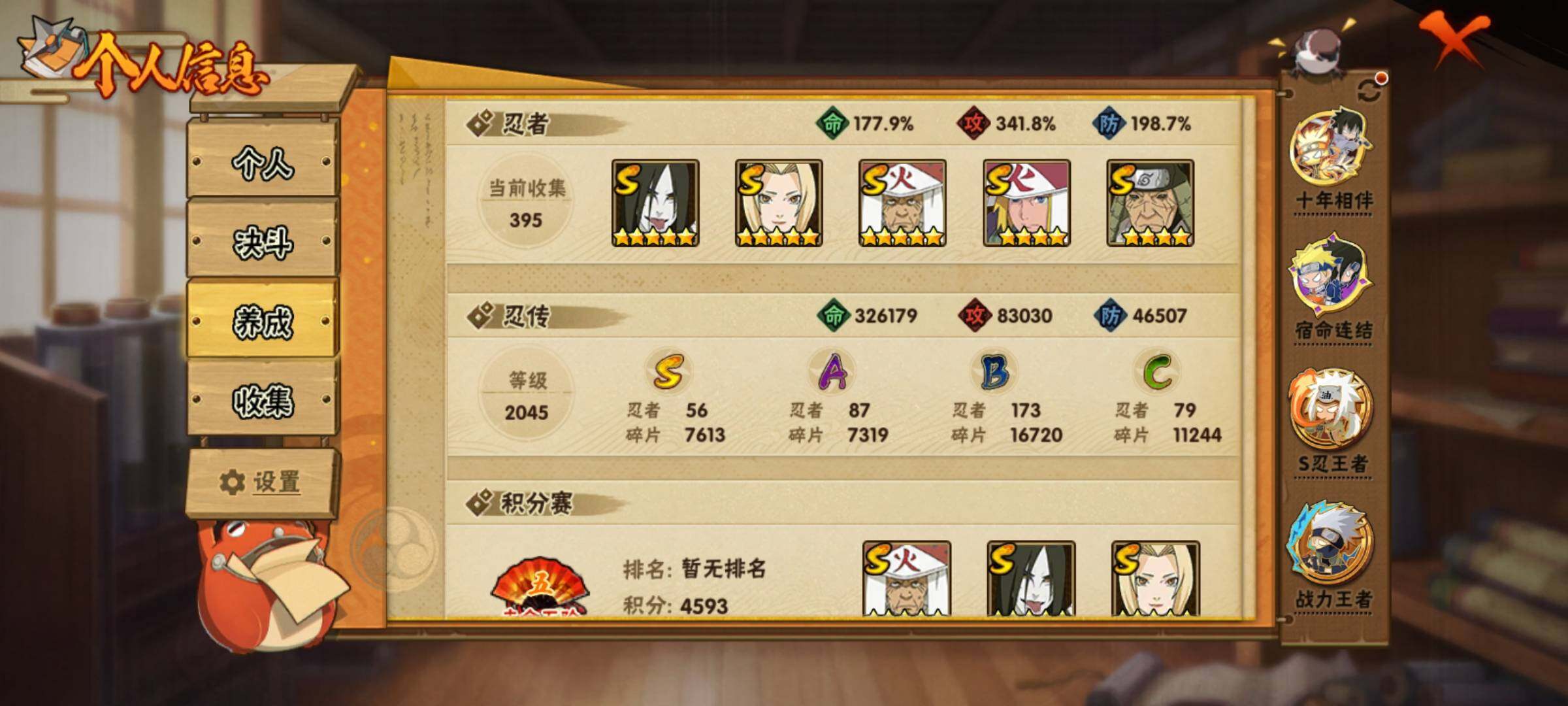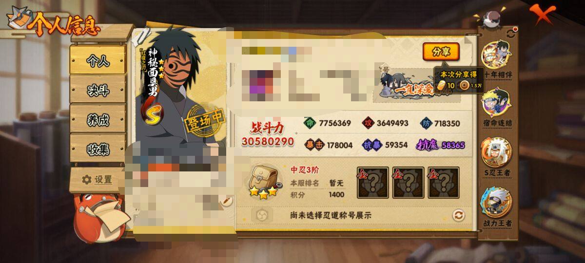 V14/战力3058W/S忍56/A忍87/通灵兽31/3星迪达拉/