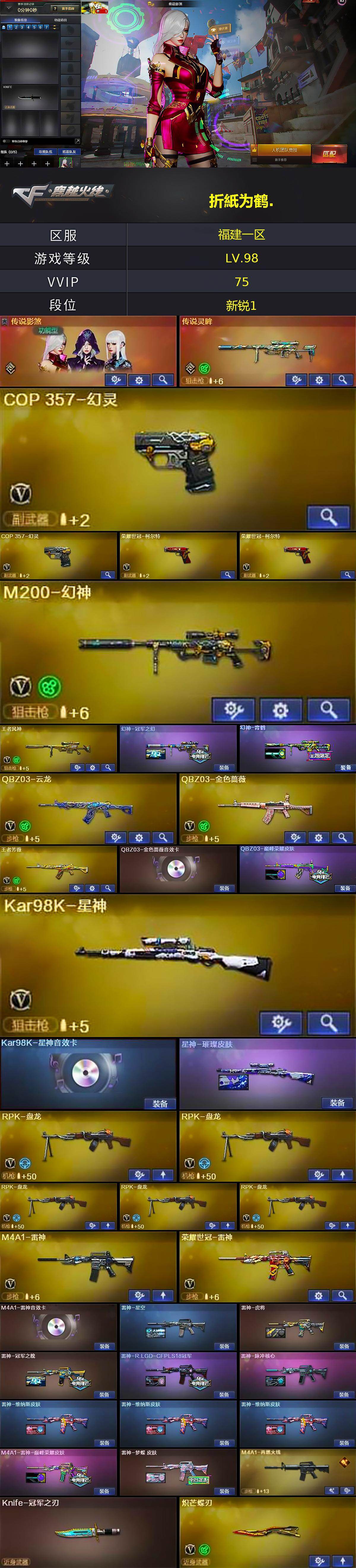 【HXD48】71V/98级/将帅/1传说/10王者/4炫金/4英雄/星神三件套/传说灵眸/传说影煞/QBZ03-金色蔷薇/HK417_朱雀/M200_幻神/青龙之魄/火麒麟世冠/雷神世冠/荣耀世冠-柯尔特/98K_星神/C.A.T/M4A1_黑骑士/RPK_盘龙/加特林_炼狱/MK5-炽火炎龙/羊驼玩偶/毁灭-孙三炮/COP 357-幻灵/沙鹰_修罗/柯尔特-赛博朋克/Knife-冠军之刃/炽芒蝶刃/荣耀世冠-龙啸/王者猎神/王者玉锋/炫金无影/炫金黑龙/炫金千变/炫金天龙/M4A1-雷神音效