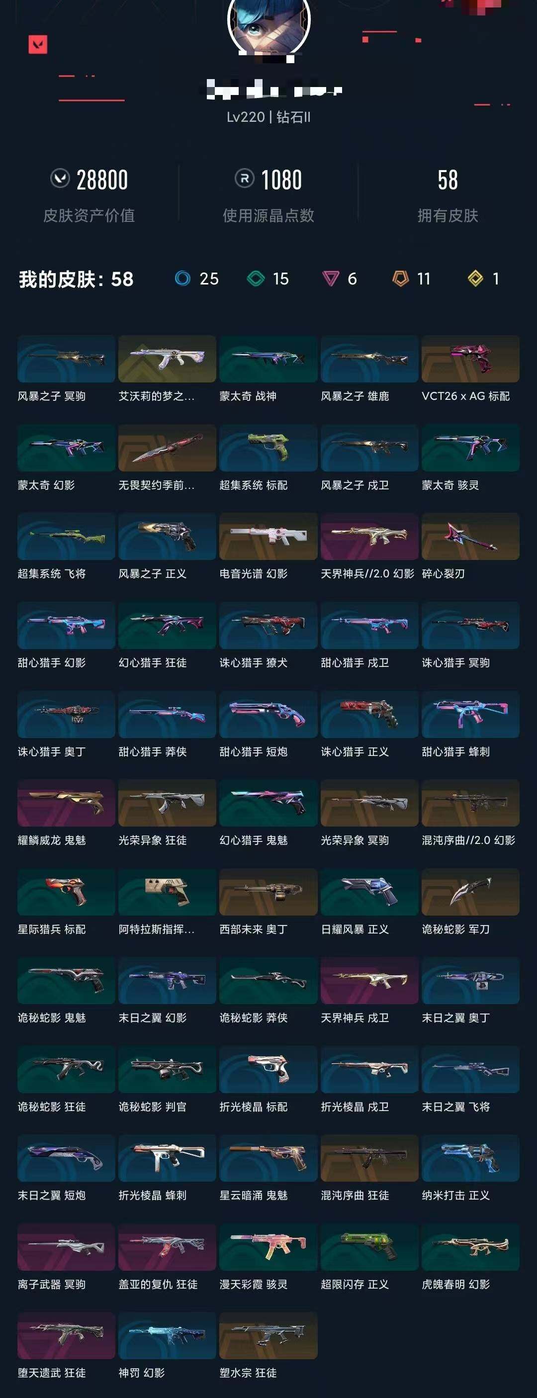 【WWN492】终极*11/传奇*1/卓越*6/皮肤*58/等级*220/段位:钻石/无畏契约季前邀请赛套装/幻棱/炼狱/维斯/暮蝶/钛狐/壹决/铁臂/捷风/雷兹/幽影/不死鸟/贤者/猎枭/蝰蛇/零/芮娜/奇乐/尚勃勒/霓虹/斯凯/夜露/星礈/K/O/海神/盖可/黑梦/钢锁/近战武器-无畏契约季前邀请赛 悲悯之刃/近战武器-诡秘蛇影 军刀/狂徒-艾沃莉的梦之翼/狂徒-混沌序曲/狂徒-塑水宗/狂徒-光荣异象/狂徒-堕天遗武/狂徒-盖亚的复仇/狂徒-诡秘蛇影/幻影-电音光谱/幻影-混沌序曲//2.0