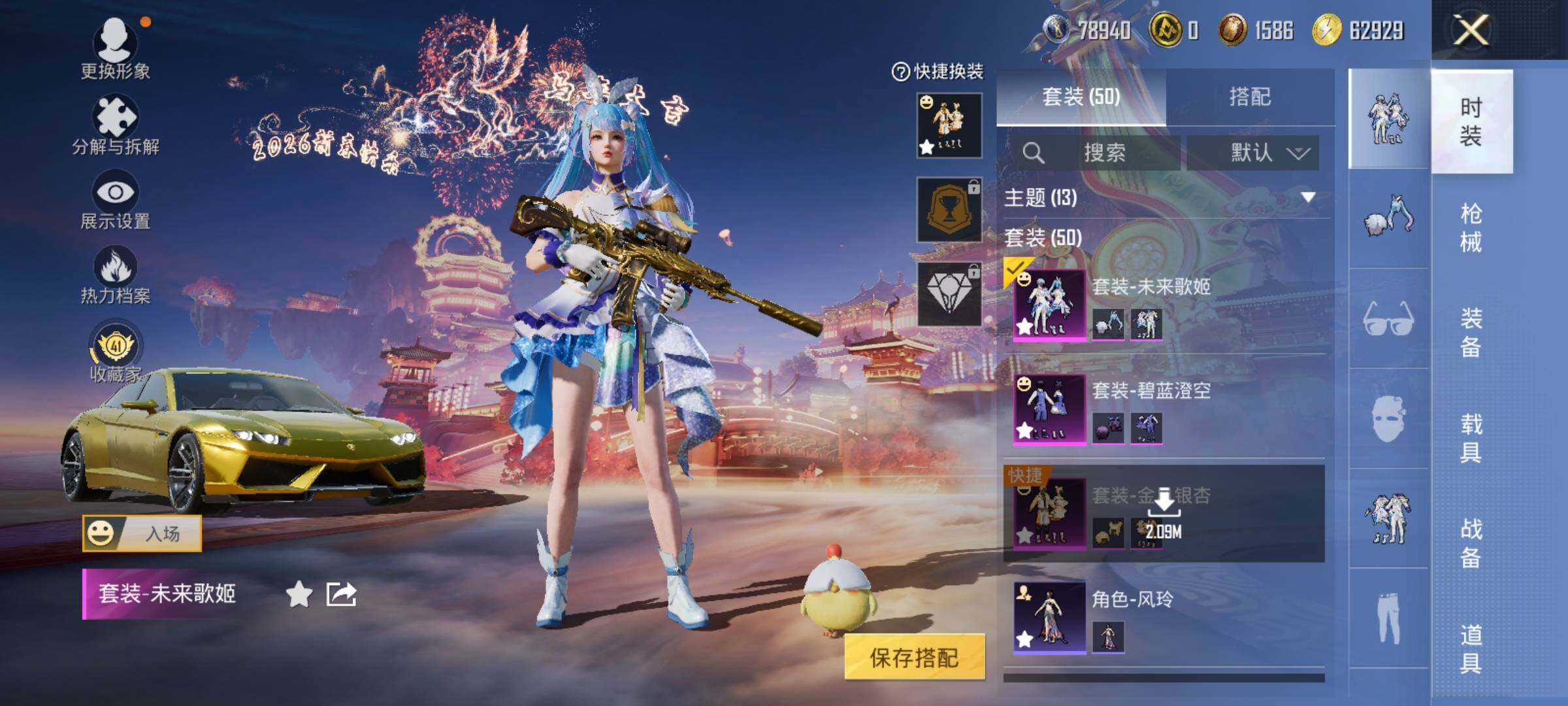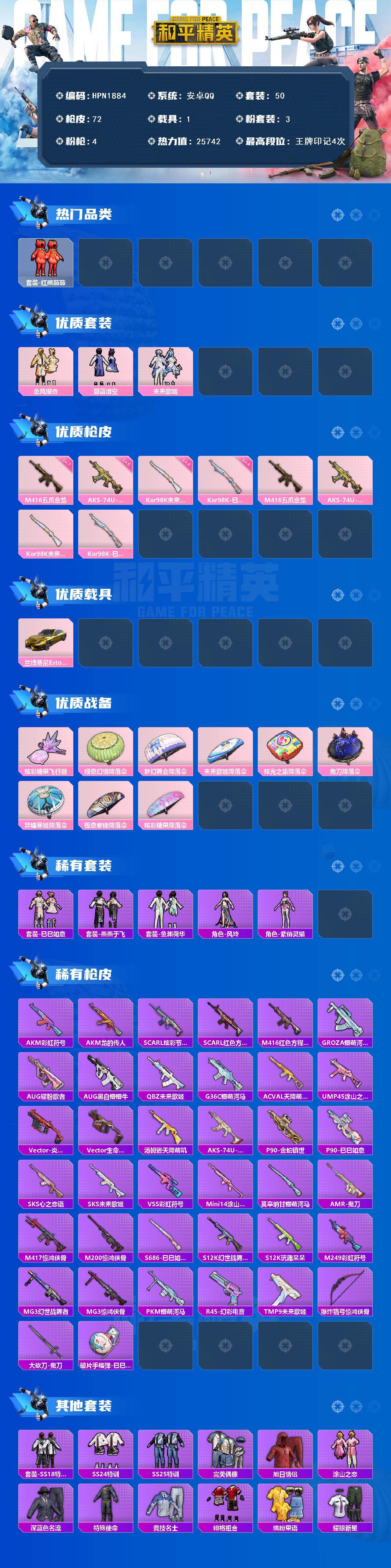 【HPN1884】50套装/枪械4/装备95/载具1/战备53/王牌印记4/热力值25742/七级M416-五爪金龙/五级AKS-74U-森灵之息/四级Kar98K-未来歌姬/四级Kar98K-巳巳如意/套装-红熊茄茄/金风银杏/碧蓝澄空/未来歌姬/兰博基尼Estoque(炫光金)/M416-五爪金龙/AKS-74U-森灵之息/Kar98K-未来歌姬/Kar98K-巳巳如意/炫彩糖果飞行器/绿意幻情降落伞/梦幻舞会降落伞/未来歌姬降落伞/炫光之旅降落伞/鬼刀降落伞/异瞳寒姬降落伞/极意拳锋降落伞