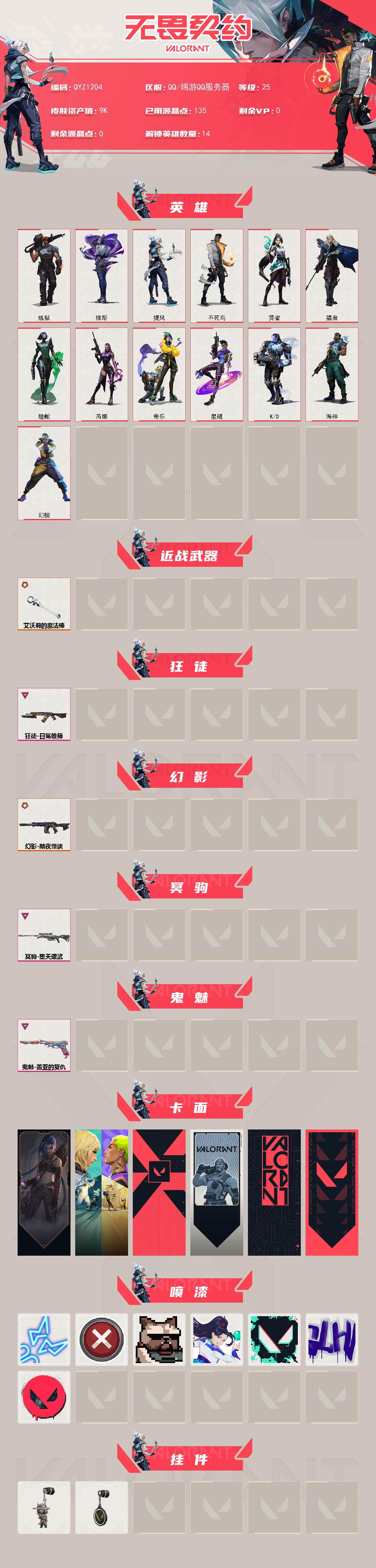 【QYZ1204】终极*2/卓越*3/皮肤*15/等级*25/段位:青铜/幻棱/炼狱/维斯/捷风/不死鸟/贤者/猎枭/蝰蛇/芮娜/奇乐/星礈/K/O/海神/近战武器-艾沃莉的魔法棒/狂徒-日冕雄师/幻影-黯夜怪谈/冥驹-堕天遗武/鬼魅-盖亚的复仇/《双城之战》金克丝 卡面/钢锁vs盖可 卡面/代号红色 卡面/新兵报到 卡面/V契约 卡面/无畏契约 卡面/霓光四射 喷漆/买装还是存钱 喷漆/关门放狗 喷漆/无畏契约GO!第一卷:贤者 喷漆/胜利属于无畏契约 喷漆/GLHF 喷漆/无畏契约 喷漆/无