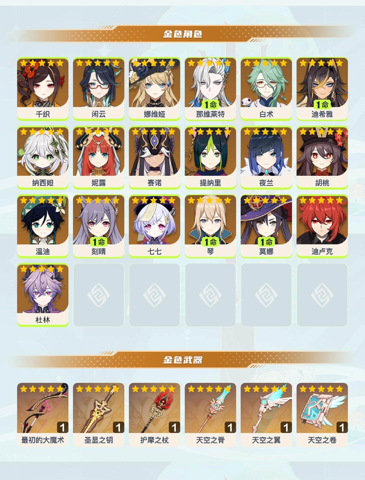 59级/31黄/女主/19个五星角色/7个五星武器/0命杜林/赛诺/千织/娜维娅/温迪/