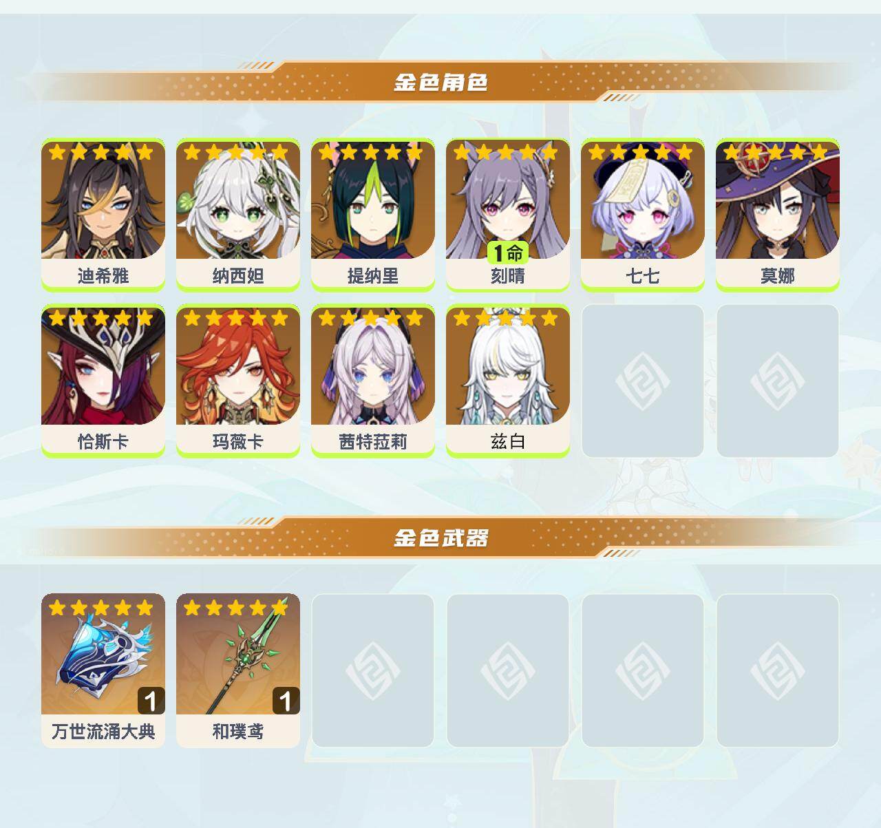 【YSX1668】55级/13黄/女主/10个五星角色/2个五星武器/恰斯卡/玛薇卡/茜特菈莉/纳西妲/0命兹白/莫娜/七七/1命刻晴/提纳里/迪希雅/和璞鸢/万世流涌大典