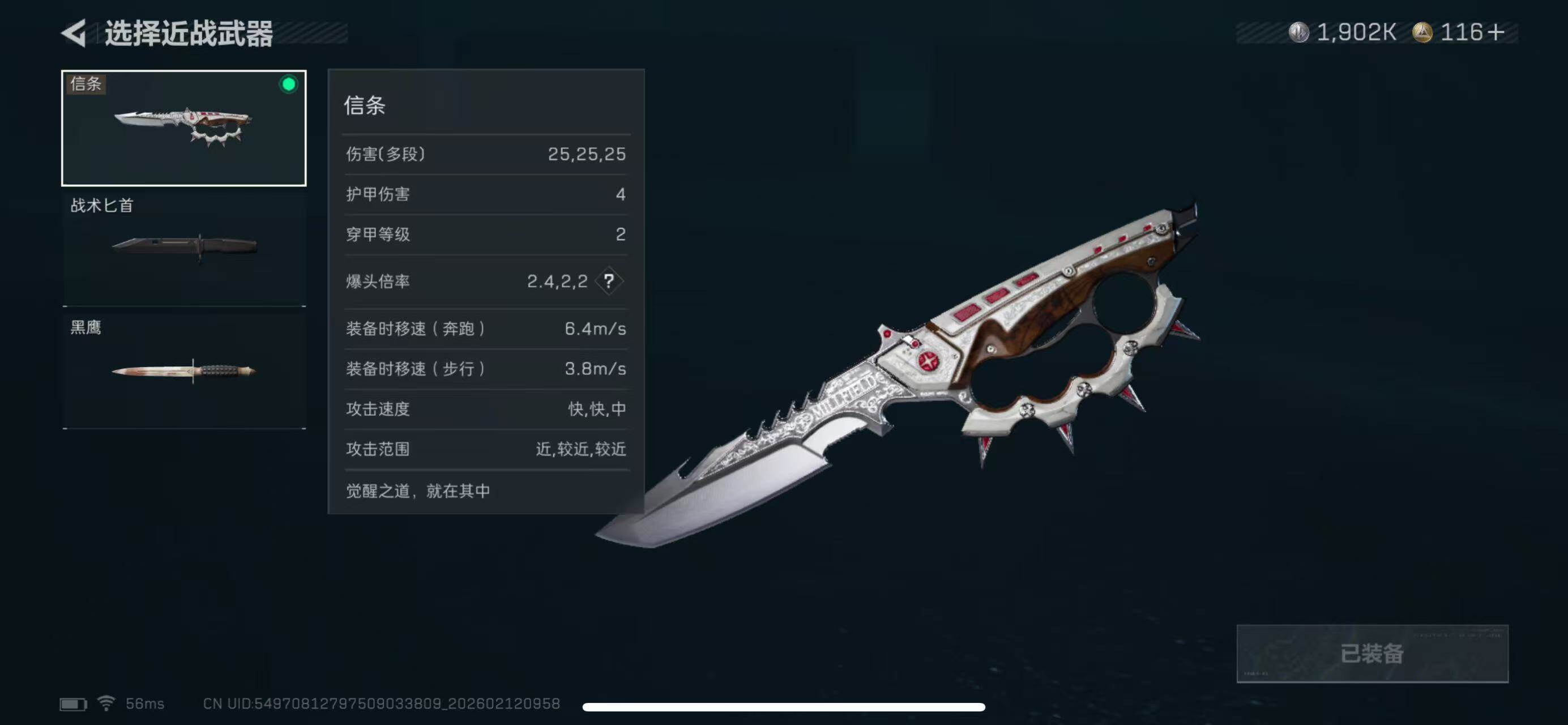 行动等级:60 总资产:111M 哈夫币:271.9W 近战武器:近战武器-信条