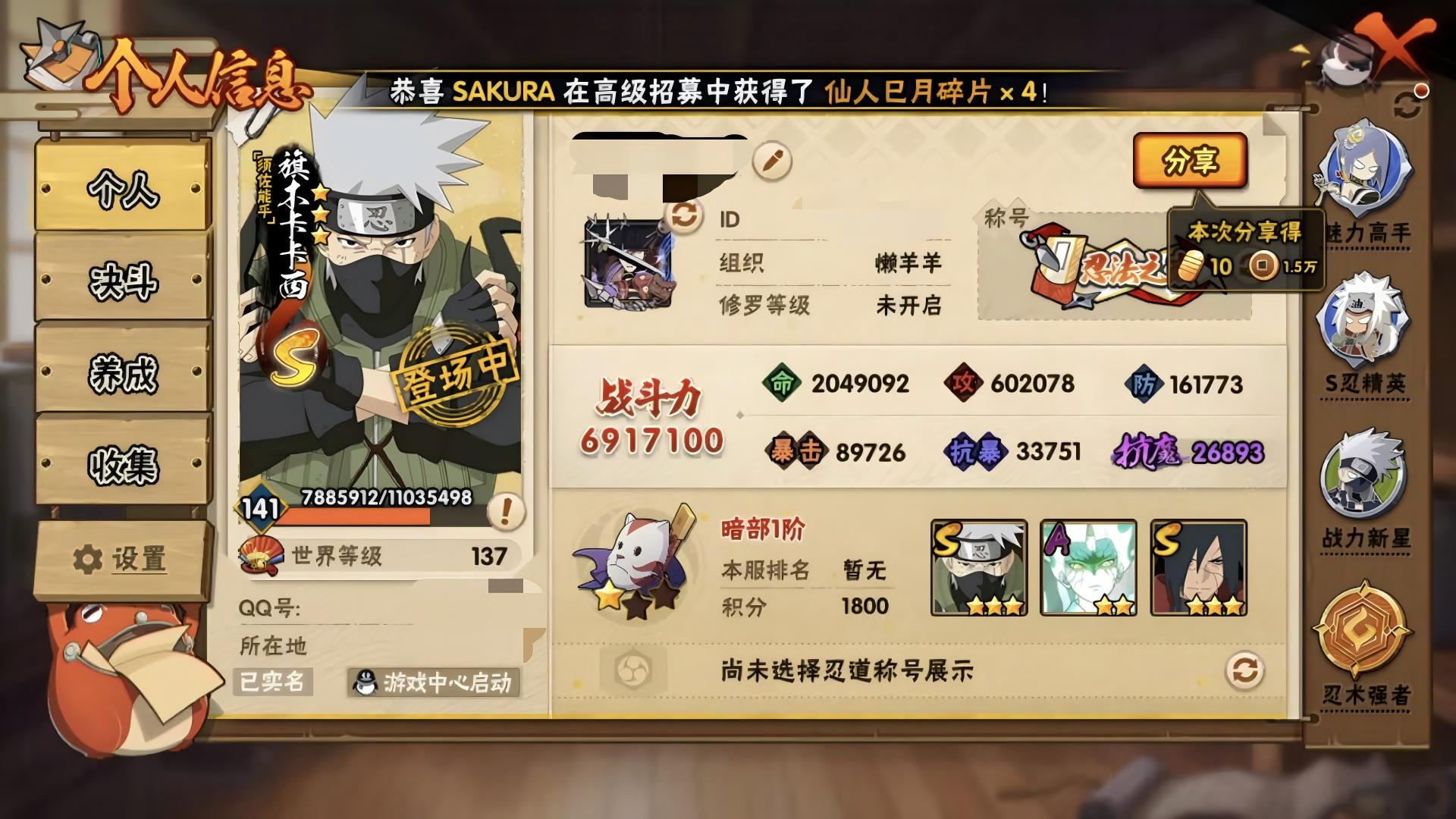 691w战力+五影斑+解斑+须佐卡卡西10S+面麻1个198