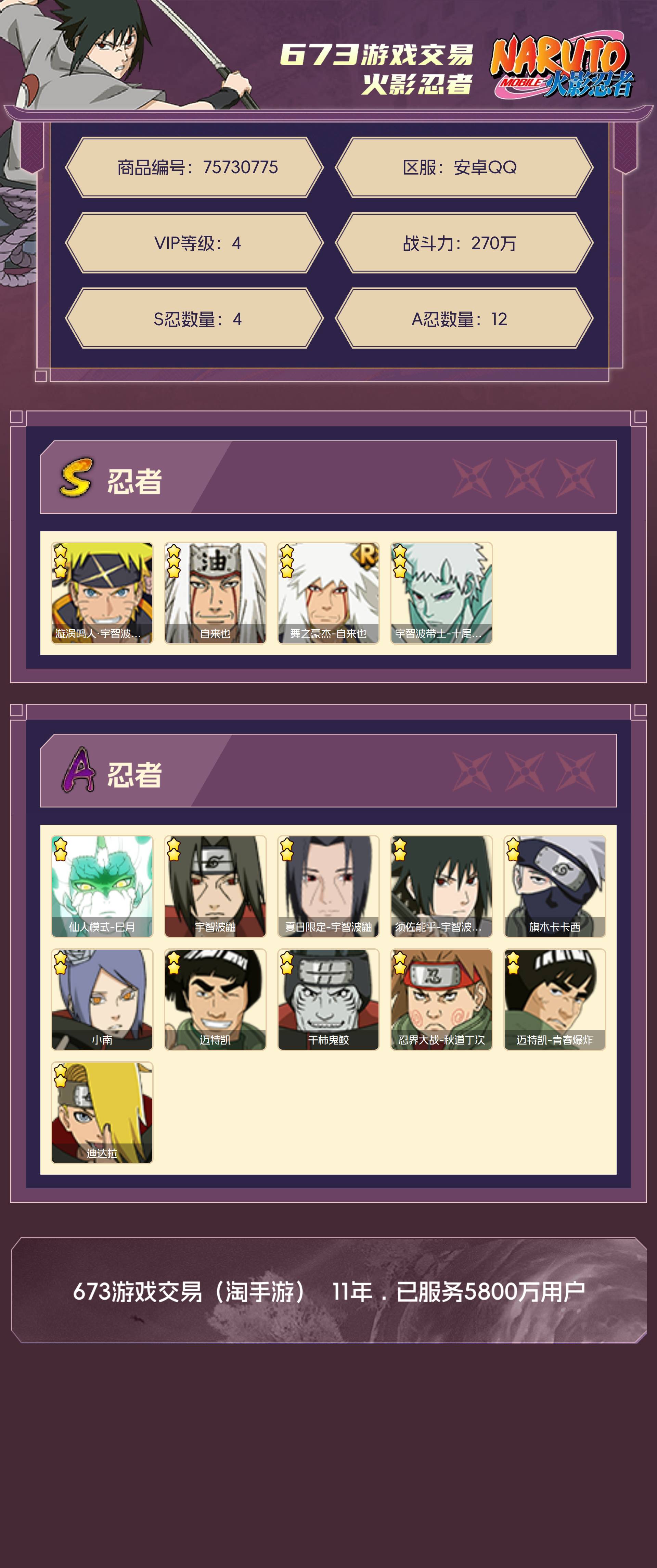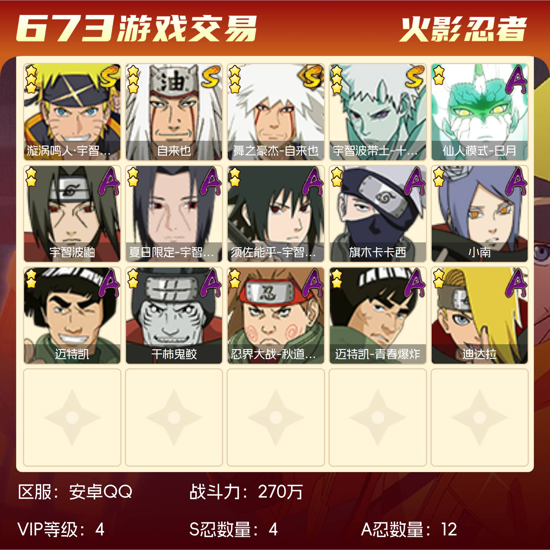 角色等级110 金币1500 战斗力270万 S忍4 A忍12 5星S忍者3 4 段位暗部