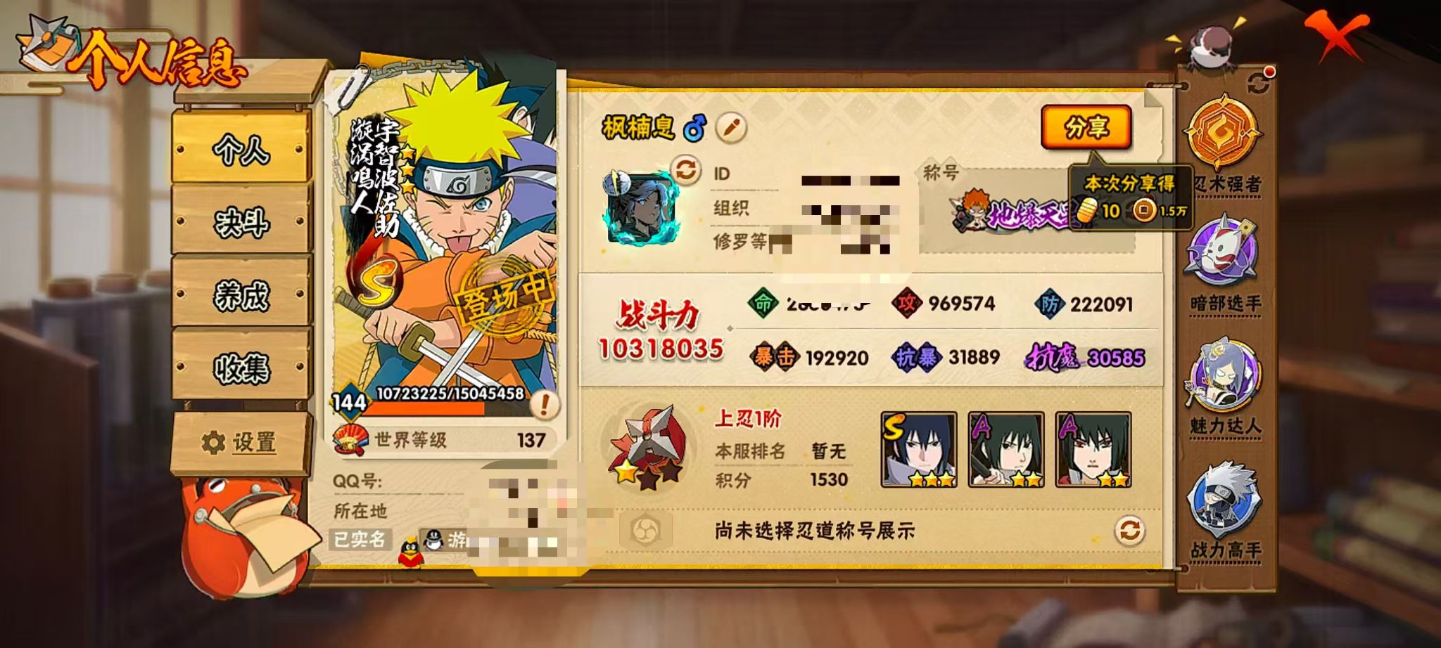 1031w战力创斑创柱19s+鲛肌融合328祈愿1个+198直购14个+国宝2个98通灵+博人168传承奥义赶紧消失!