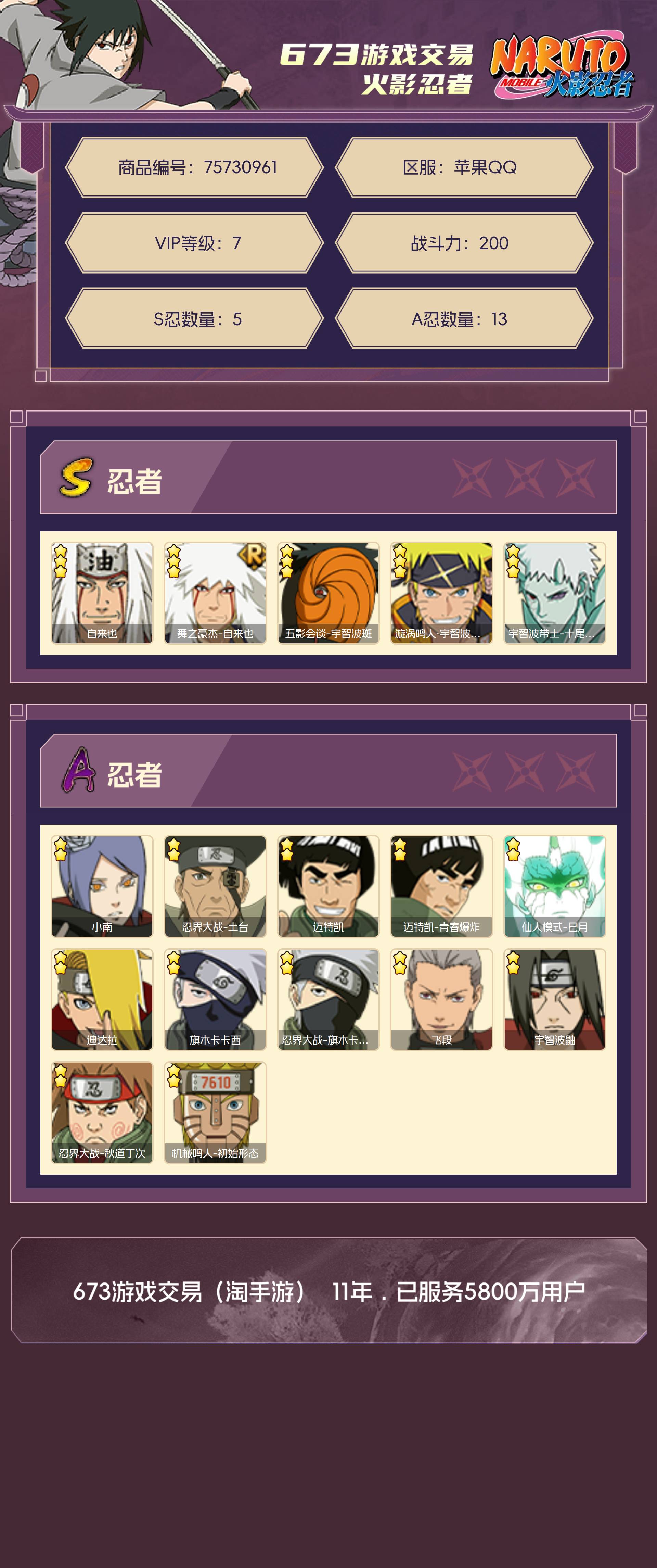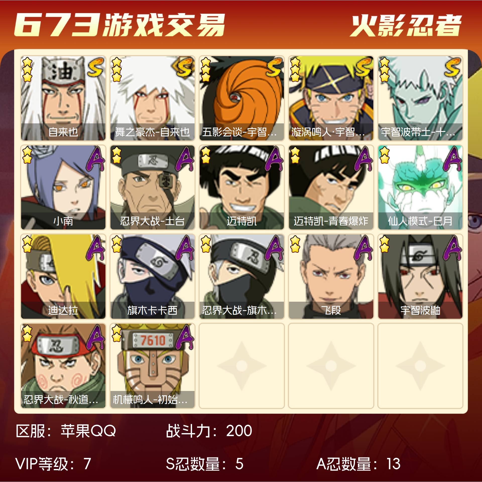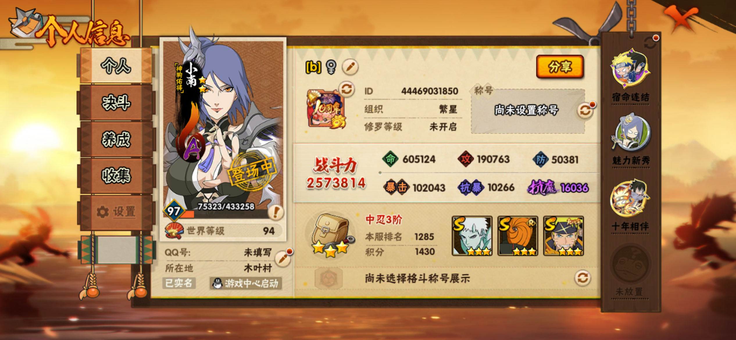 角色等级97 金币4000 战斗力200 S忍5 A忍13 5星S忍者4 7 段位中忍