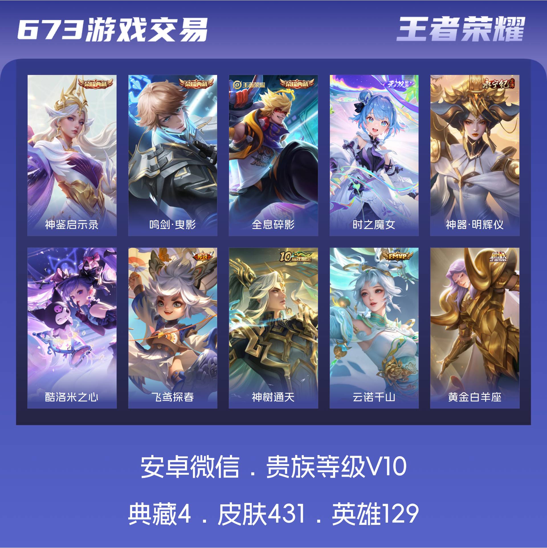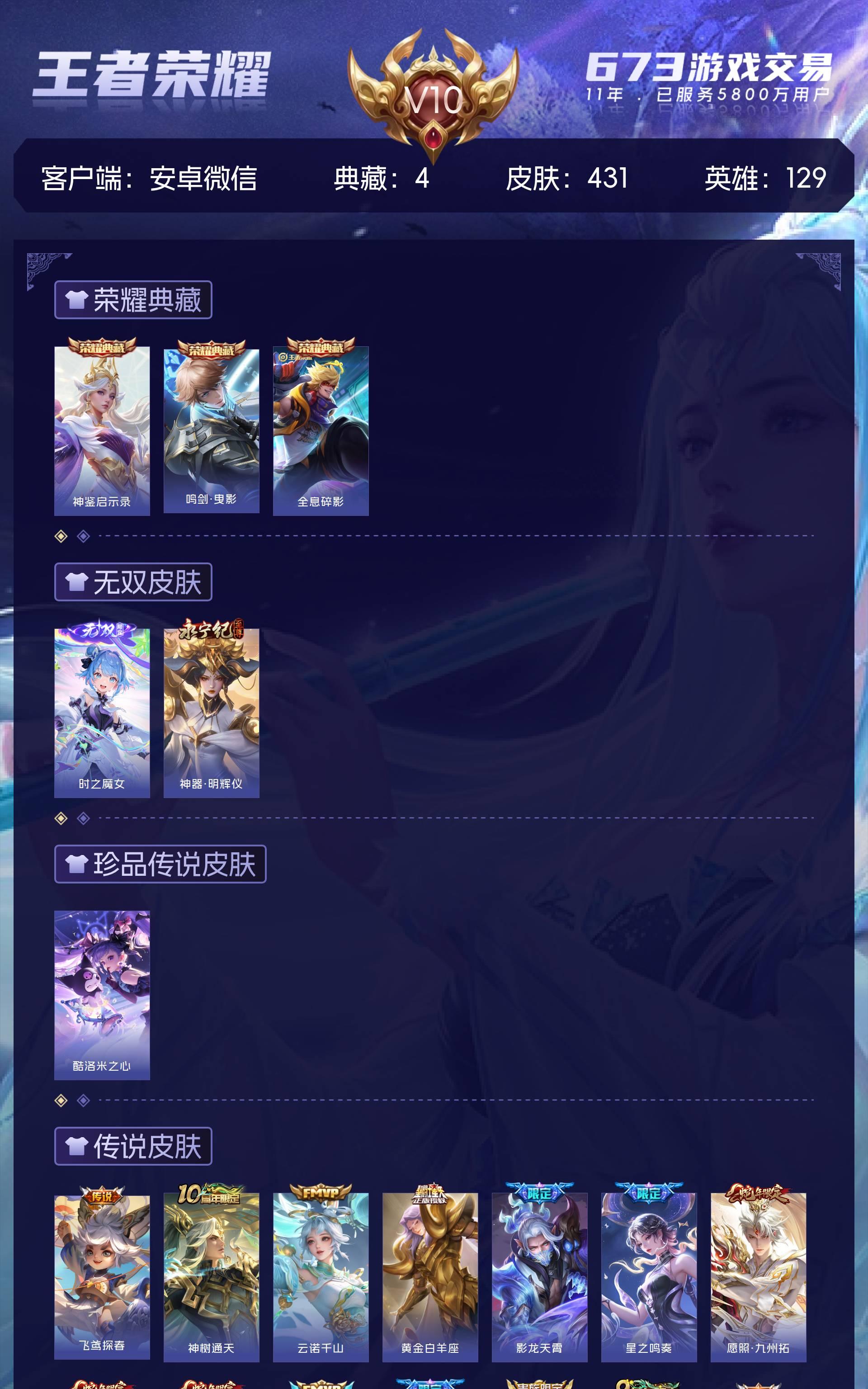 V10 皮肤431 英雄129 至尊星耀 荣耀典藏4 无双皮肤2 珍品传说1 传说45 其他皮肤386